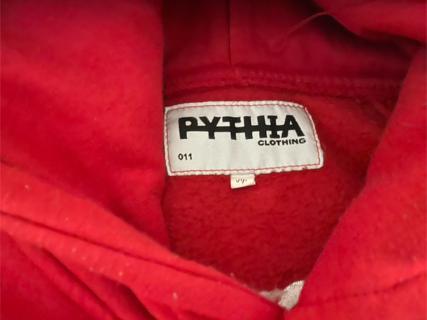 This is a red hoodie from PYTHIA. It features embroidered hearts on hood cover and a barbed wire heart graphic with the PYTHIA logo. The back has the text "IF YOU CAN MAKE SOMEONE'S DAY YOU SHOULD". Paid $150 CAD/$110 USD