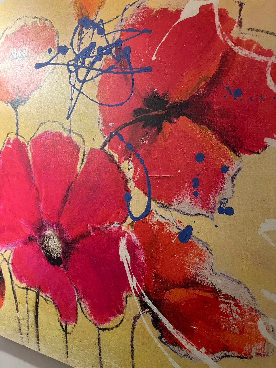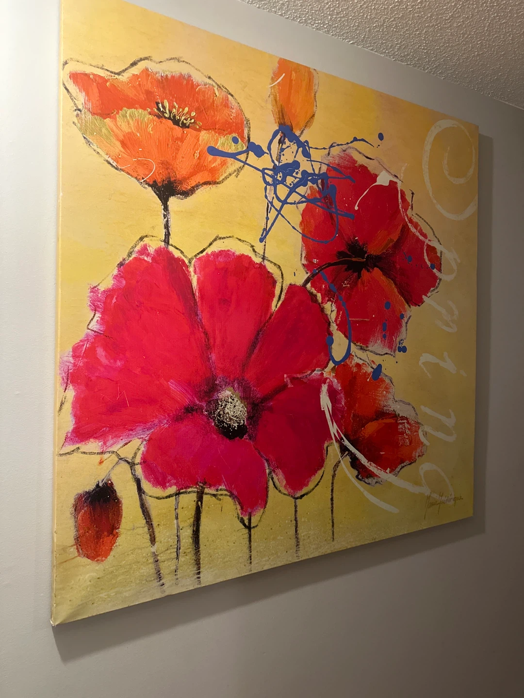 A vibrant canvas art piece featuring bold red and orange poppies with abstract blue and white splatters. Signed by artist Marie Frederique. Adds a pop of colour to any room!
