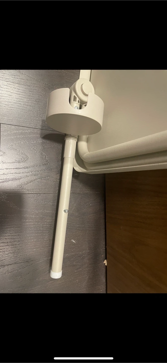 This beige bedside table is adjustable and includes a convenient cup holder. It's made of sturdy metal. This table is perfect for keeping essentials close by when you're in bed or relaxing on the couch.