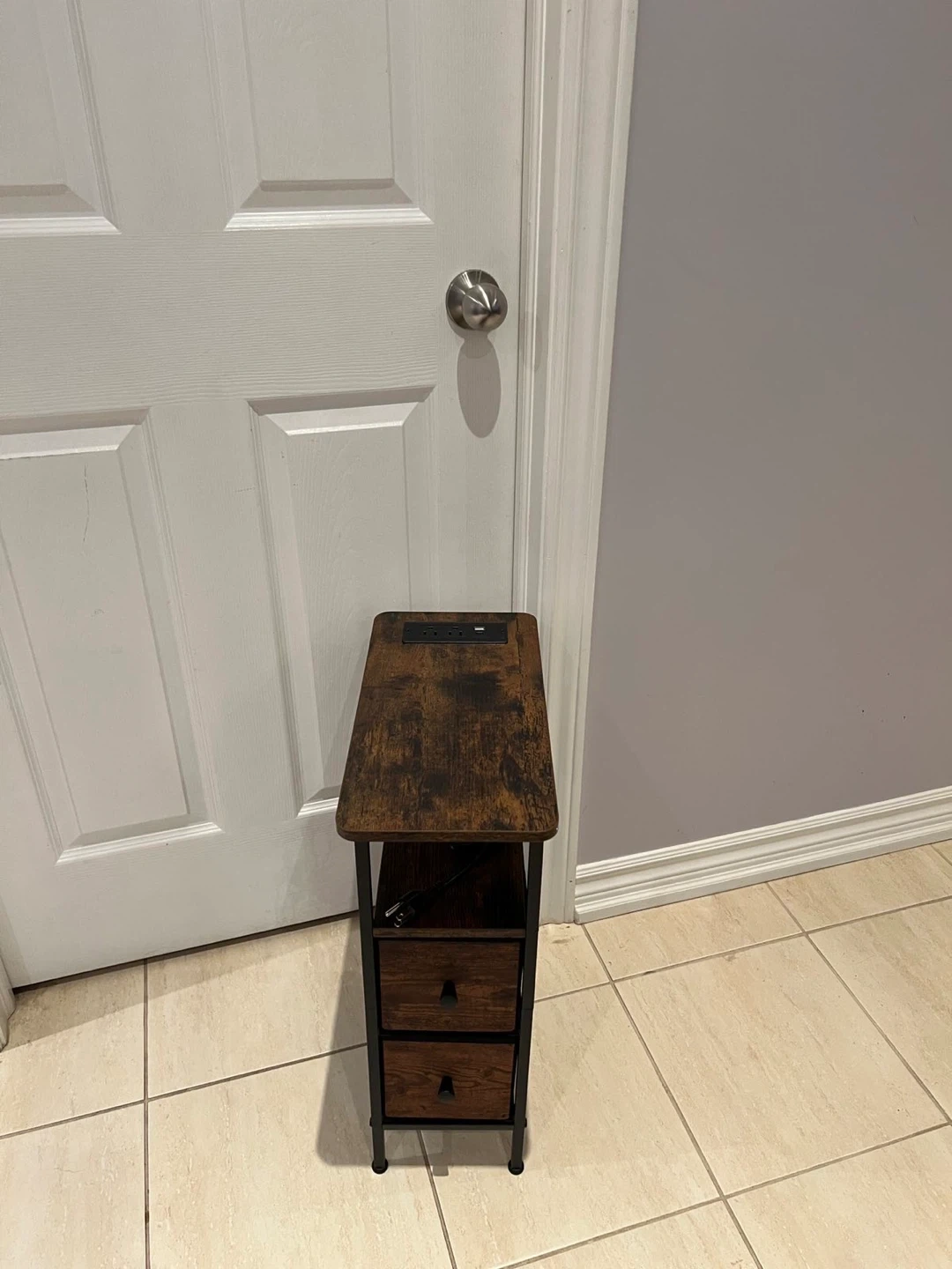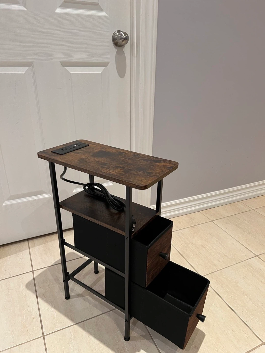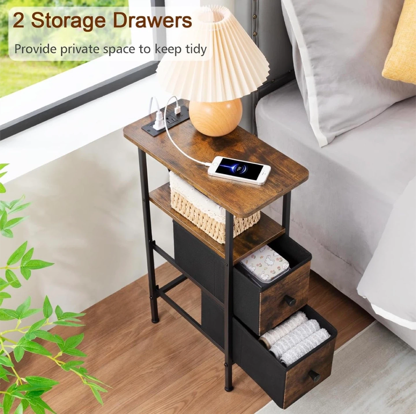 This compact end table features a rustic wood-grain finish with black metal legs. It includes a built-in power strip with two AC outlets and two USB ports, perfect for charging devices. The table has a shelf and two fabric drawers for storage. Great for tight spaces!