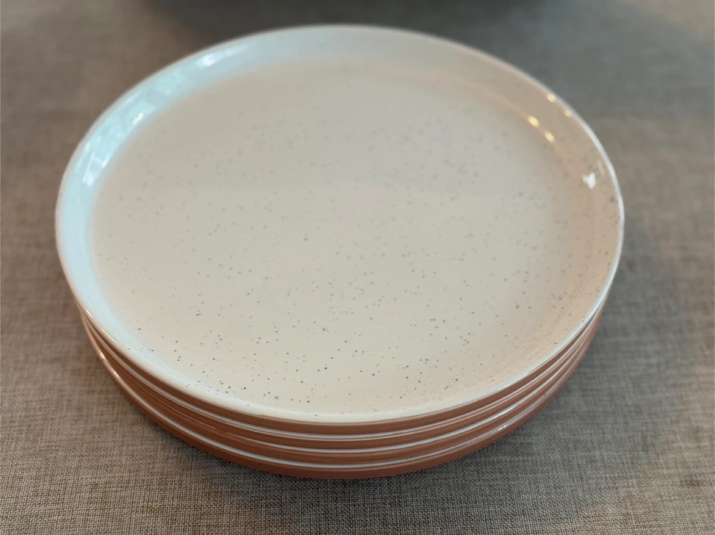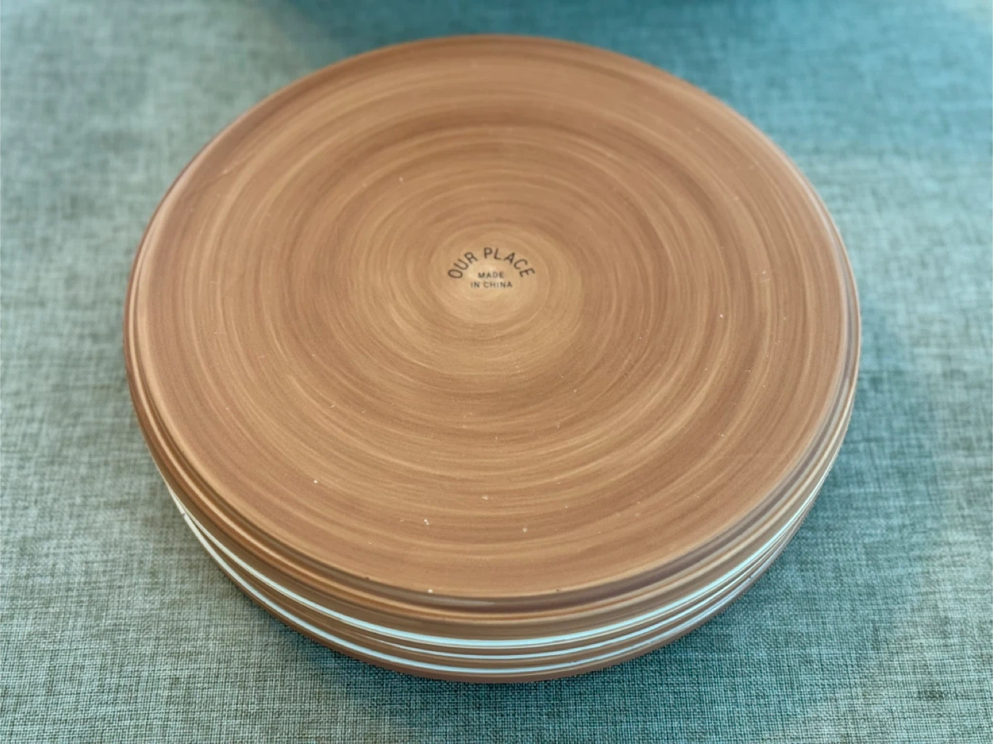 A set of four large hand-speckled ceramic dinner plates from Our Place (makers of AlwaysPan).