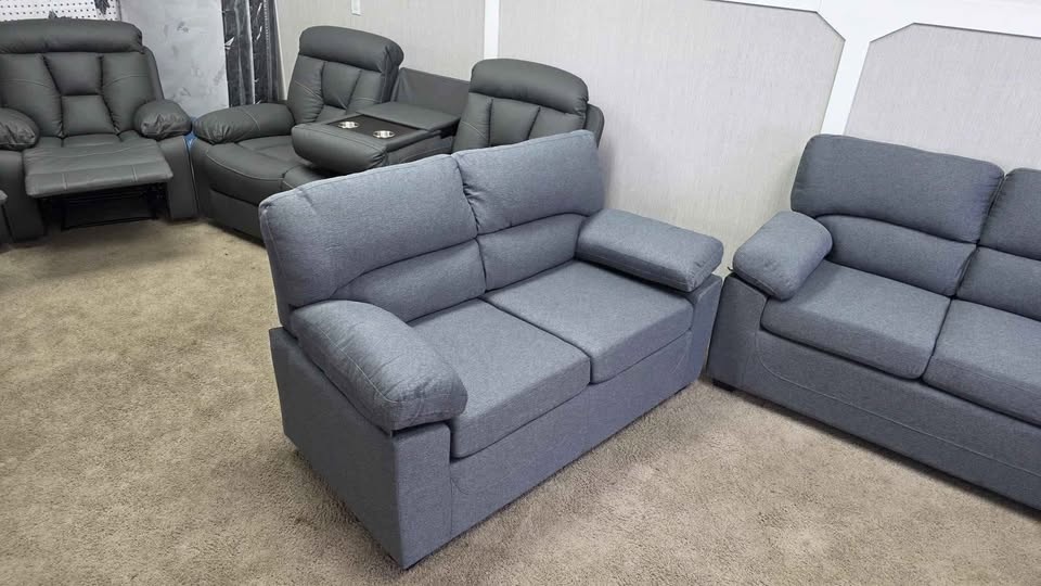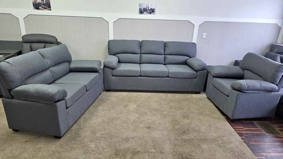 Brand new, modern couch set in excellent condition. Very comfortable with thick cushions and strong support. The covers have zippers for easy washing. Neutral color that fits any living room décor. Perfect for apartments, houses, or offices. Easy to transport as it comes in 3 small boxes.