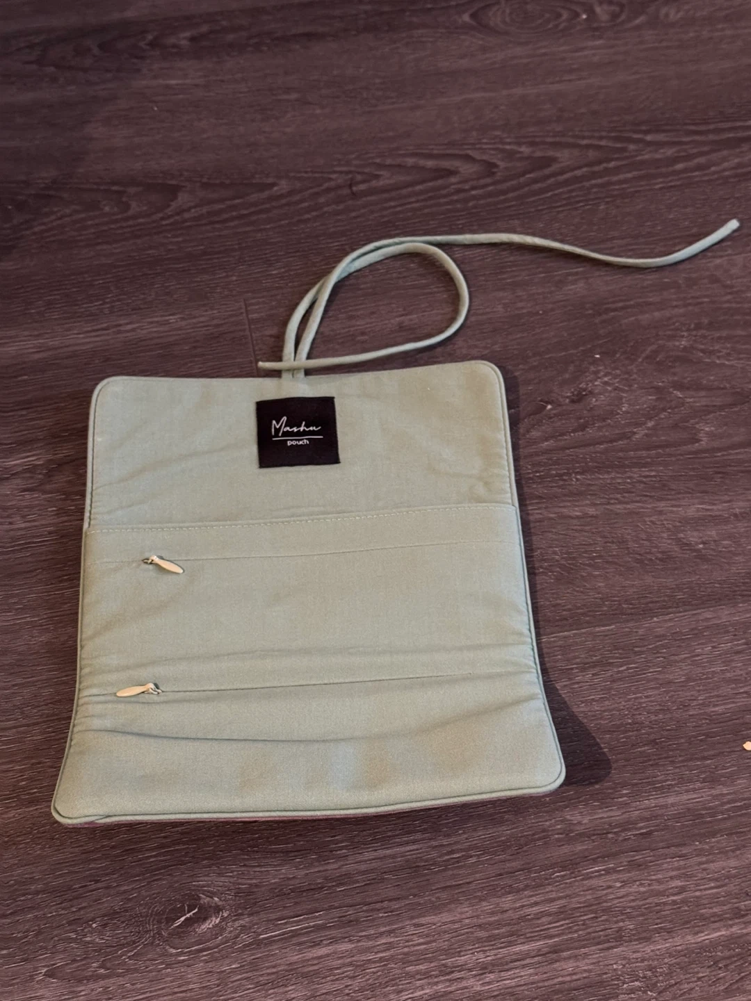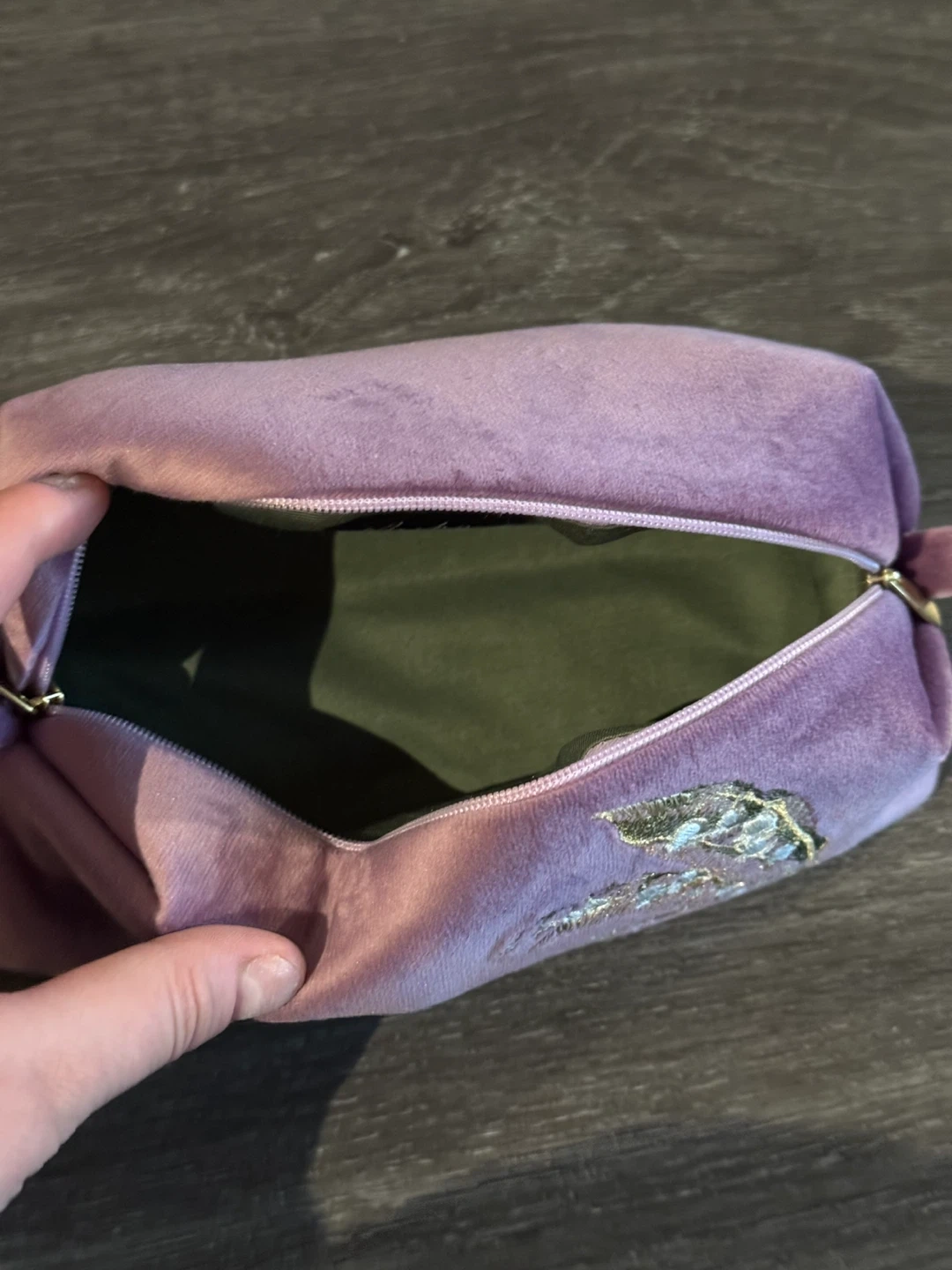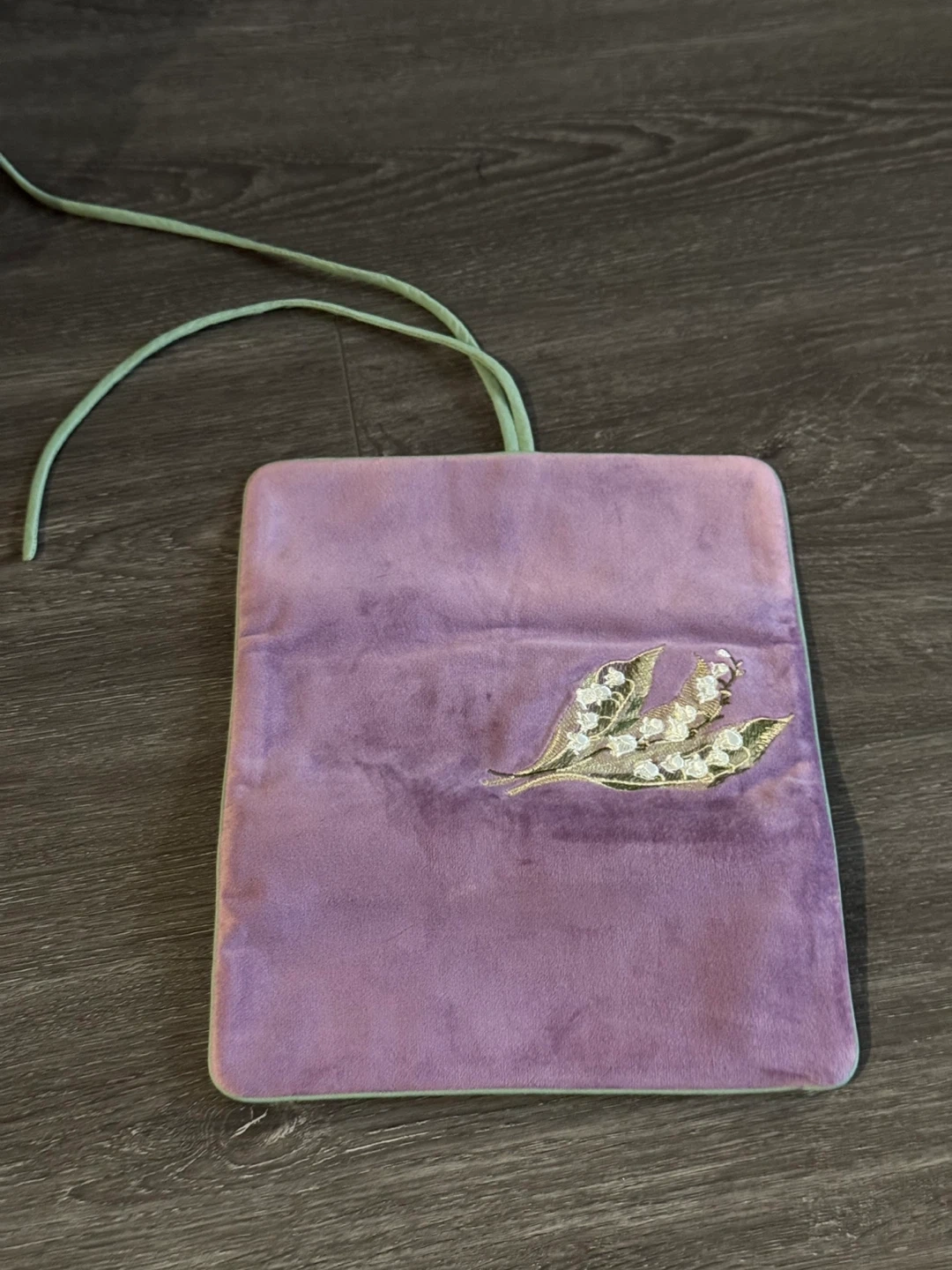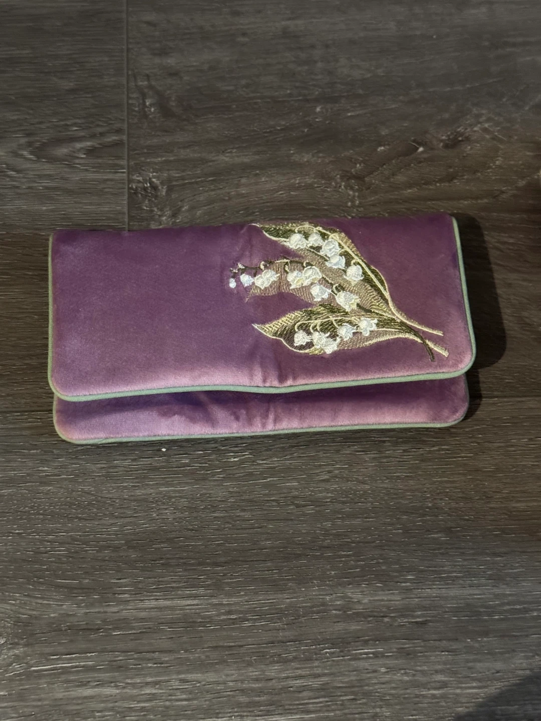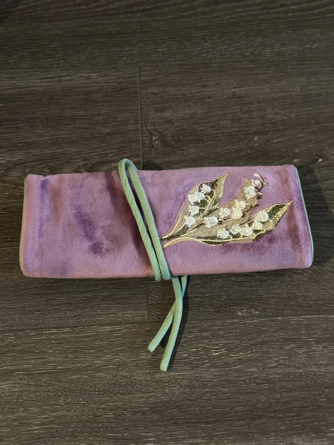 This Masha pouch features a soft velvet exterior in a lovely purple hue, adorned with delicate lily of the valley embroidery. It fastens with a tie closure and has multiple interior pockets with zippers for organization. It's a stylish and functional accessory for essentials!
