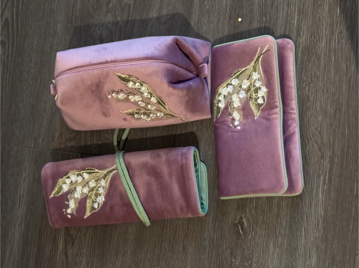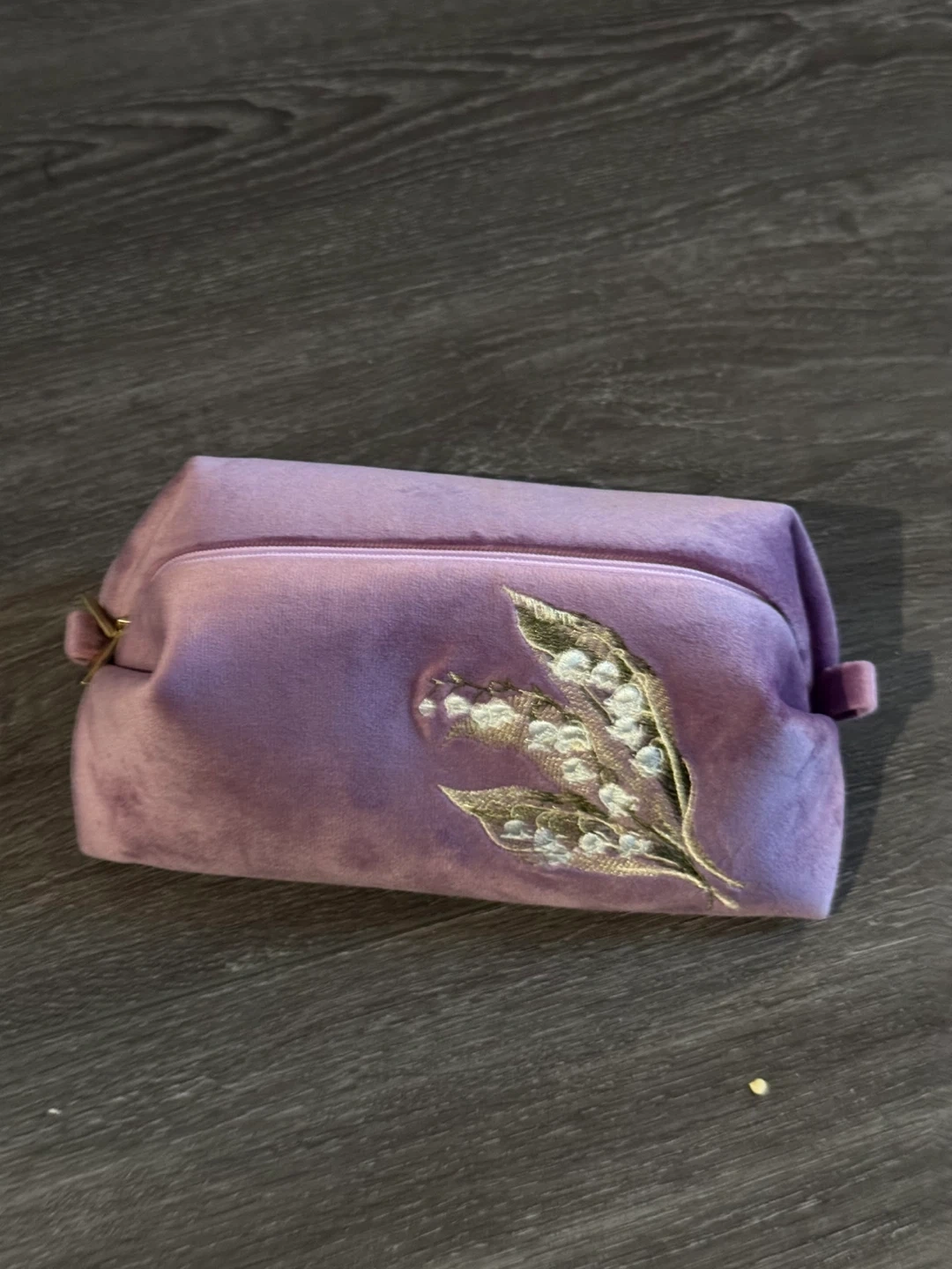 This Masha pouch features a soft velvet exterior in a lovely purple hue, adorned with delicate lily of the valley embroidery. It fastens with a tie closure and has multiple interior pockets with zippers for organization. It's a stylish and functional accessory for essentials!