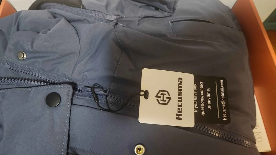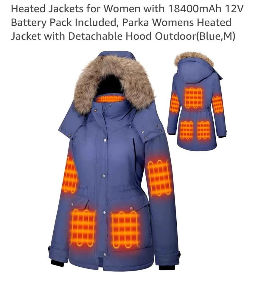 Brand new women's heated parka jacket. Includes 18400mAh 12V battery pack. Detachable hood. Outdoor style. Blue, size Medium.