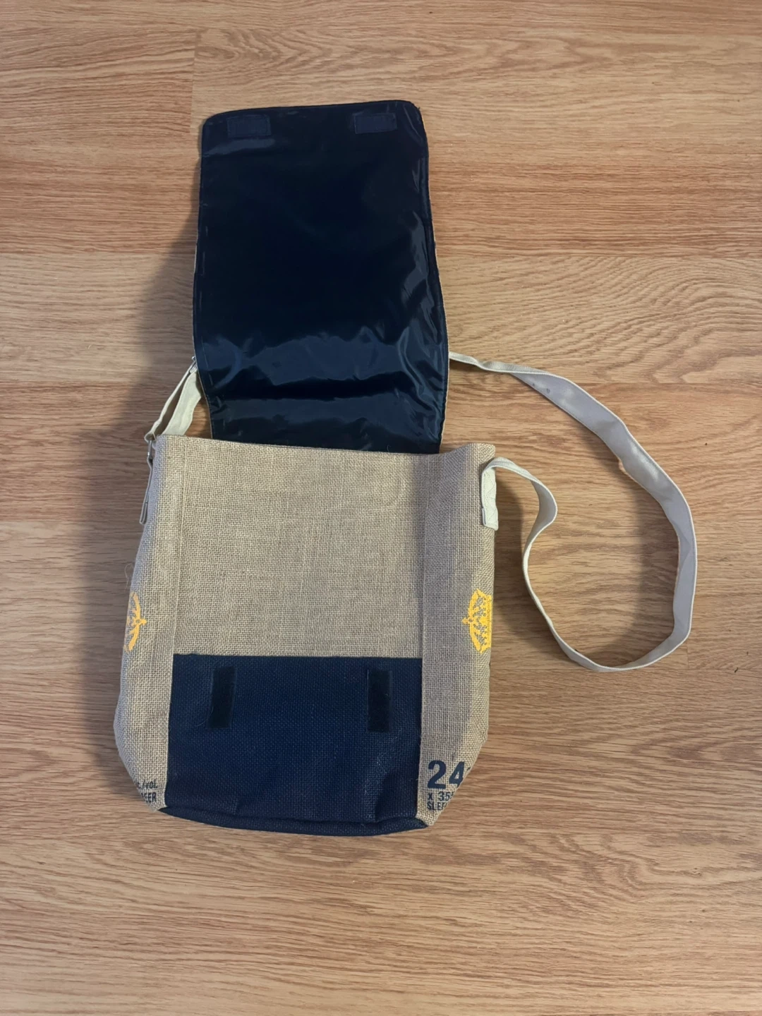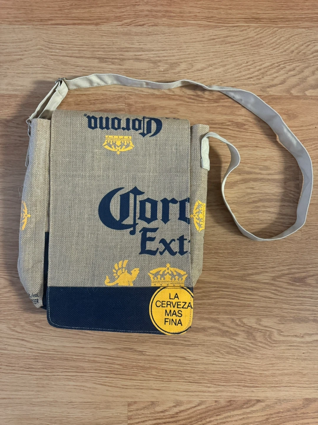 Cool Corona Extra 24-can messenger bag. It has a burlap-like exterior texture and adjustable strap. The flap has no closure. This bag is great for carrying everyday essentials or for a beer collector!