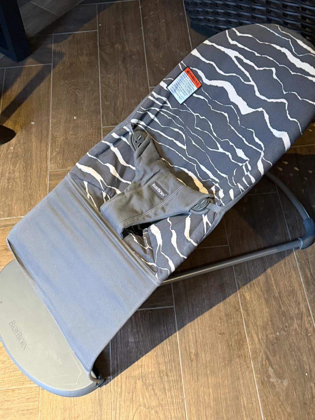 BabyBjörn Bouncer Balance Soft in a grey and white pattern. It's made with a comfortable fabric. The bouncer is designed for babies. It's a great way to keep little ones entertained safely.