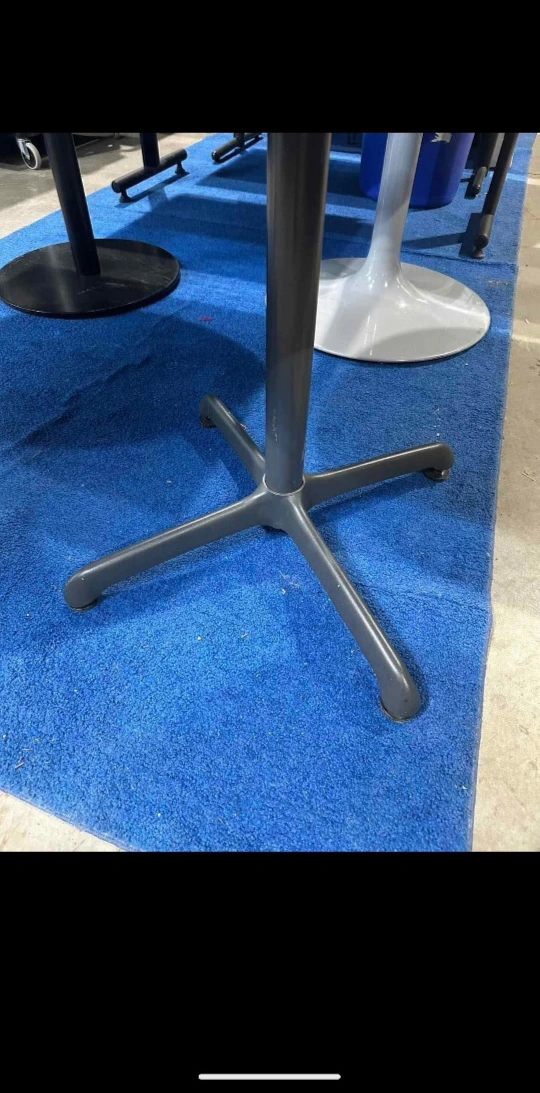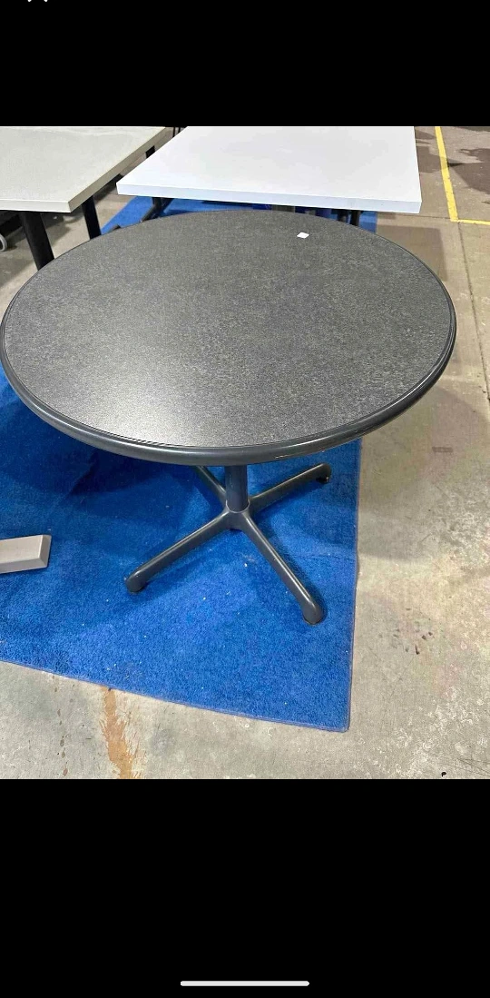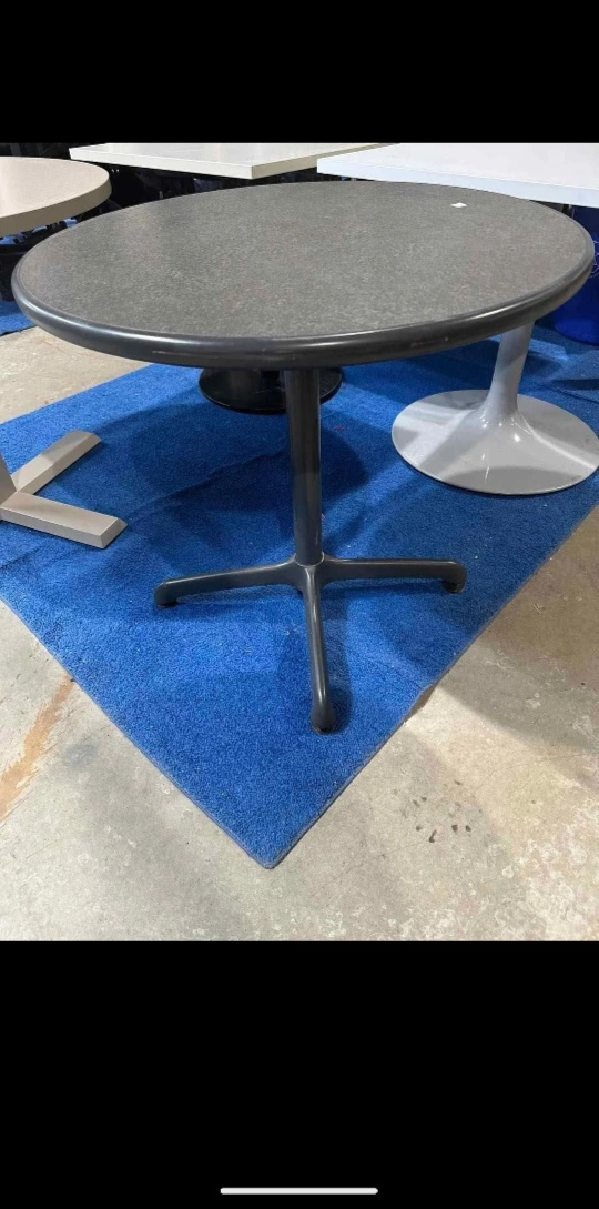 Small office meeting / Side table. Dark grey. Grey metal pedestal base with feet. Measures 30” wide. 28 1/2” high. Good condition. $100 plus HST. Pick up near Gage and Belmont in Kitchener Monday-Friday from 12-5. By appointment. Check out my other ads! And reach out if you have any questions or are interested!