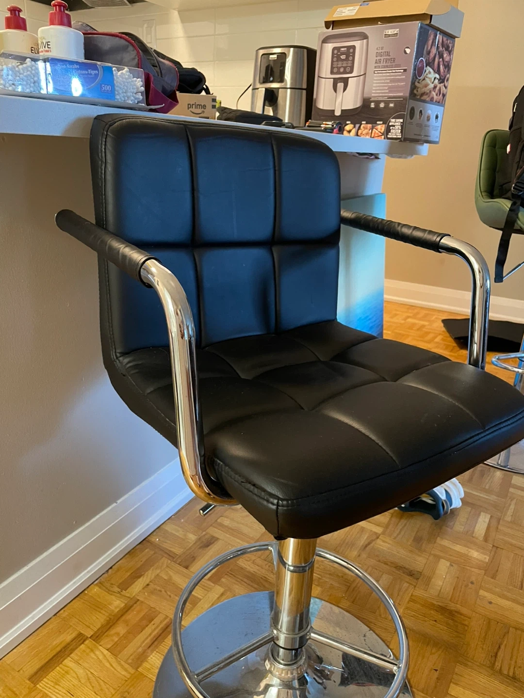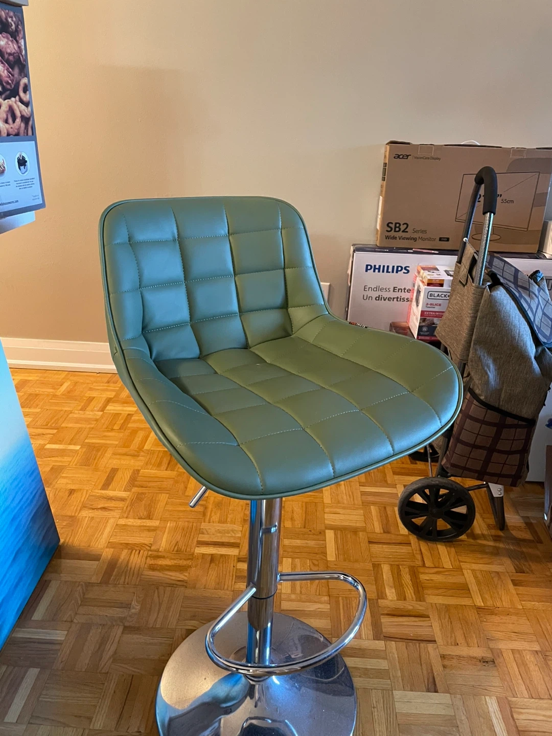 25I'm selling 2 stylish bar stool with an adjustable height. It features a comfortable, quilted seat in a lovely green and black colour. Perfect for adding a touch of modern flair to your kitchen or bar area!