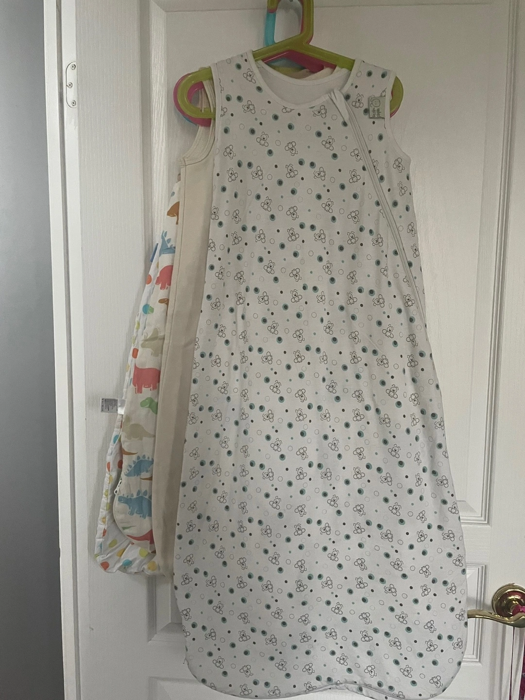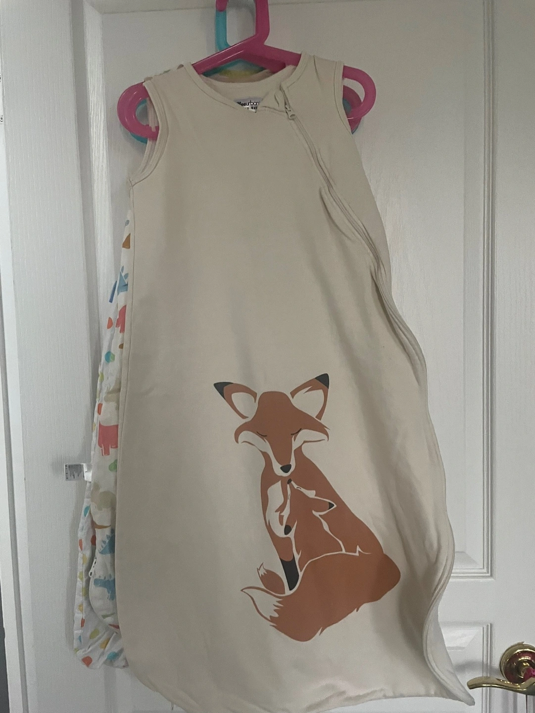 38Two sleep sacks, various sizes and designs. One features a bees print and the other depicts a fox and kit. Zipper closure. Good used condition. The fox is L 92 and the flying bees is 100 cm length Pick up only Contactless porch pick up next day after e transfer or cash only at the set appointment