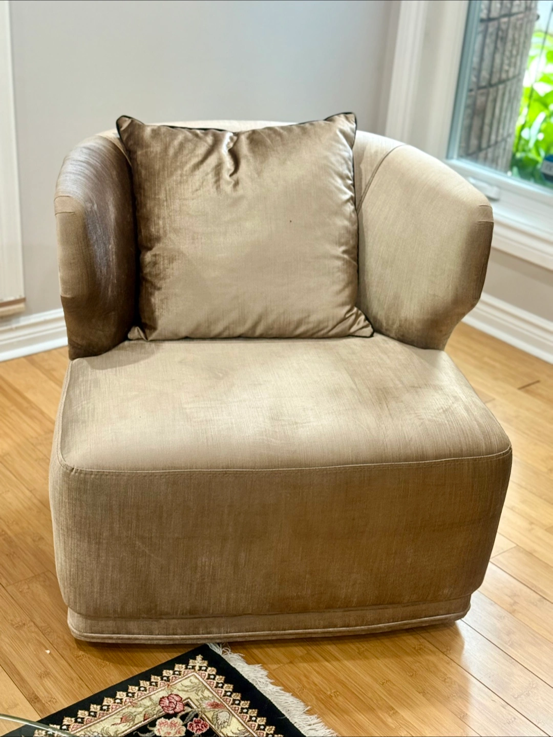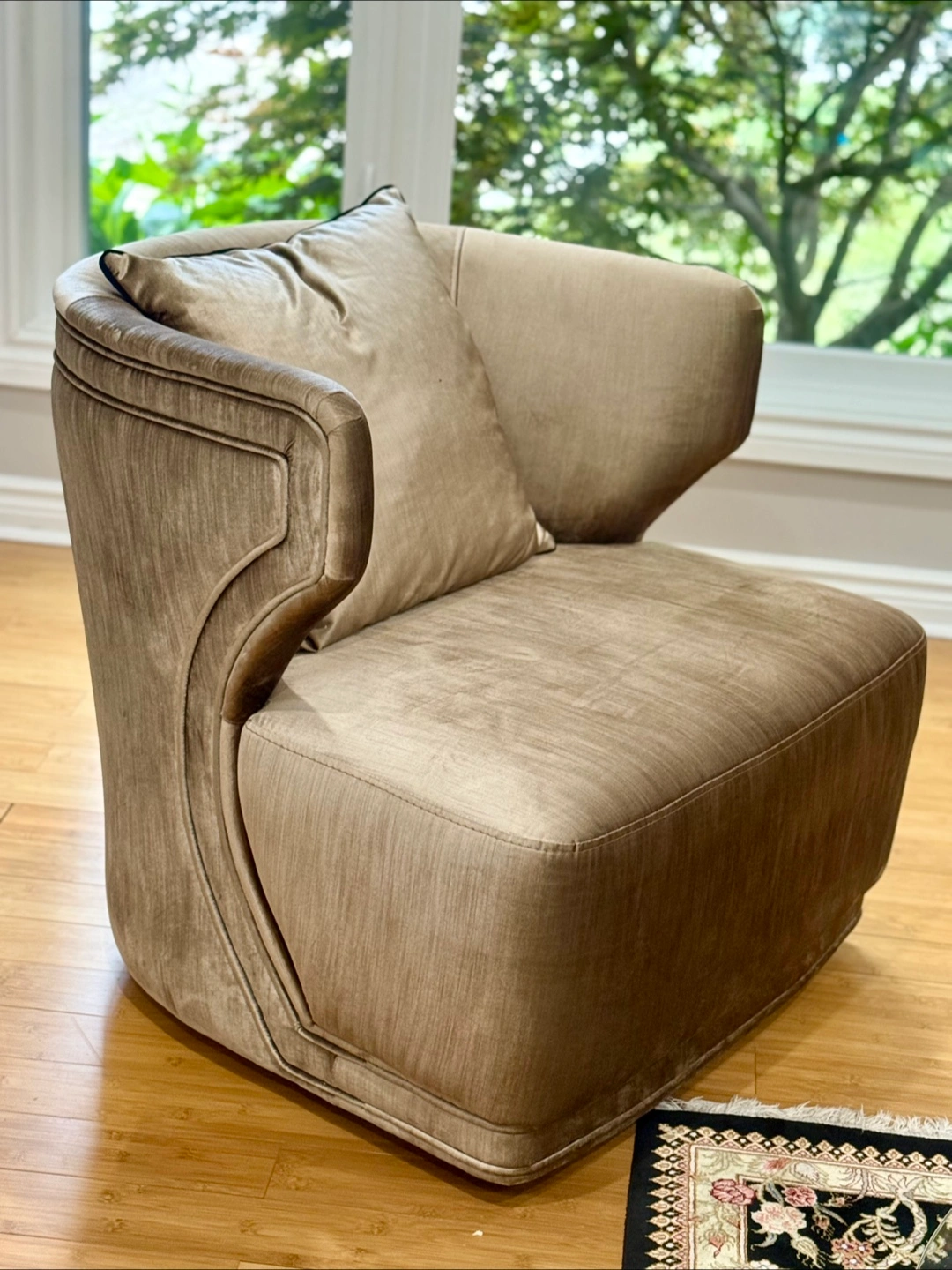 Selling 2 stylish beige velvet accent chairs. It's in great condition and would be a lovely addition to any room. The chair features a comfortable cushion and unique design, perfect for adding a touch of elegance to your home