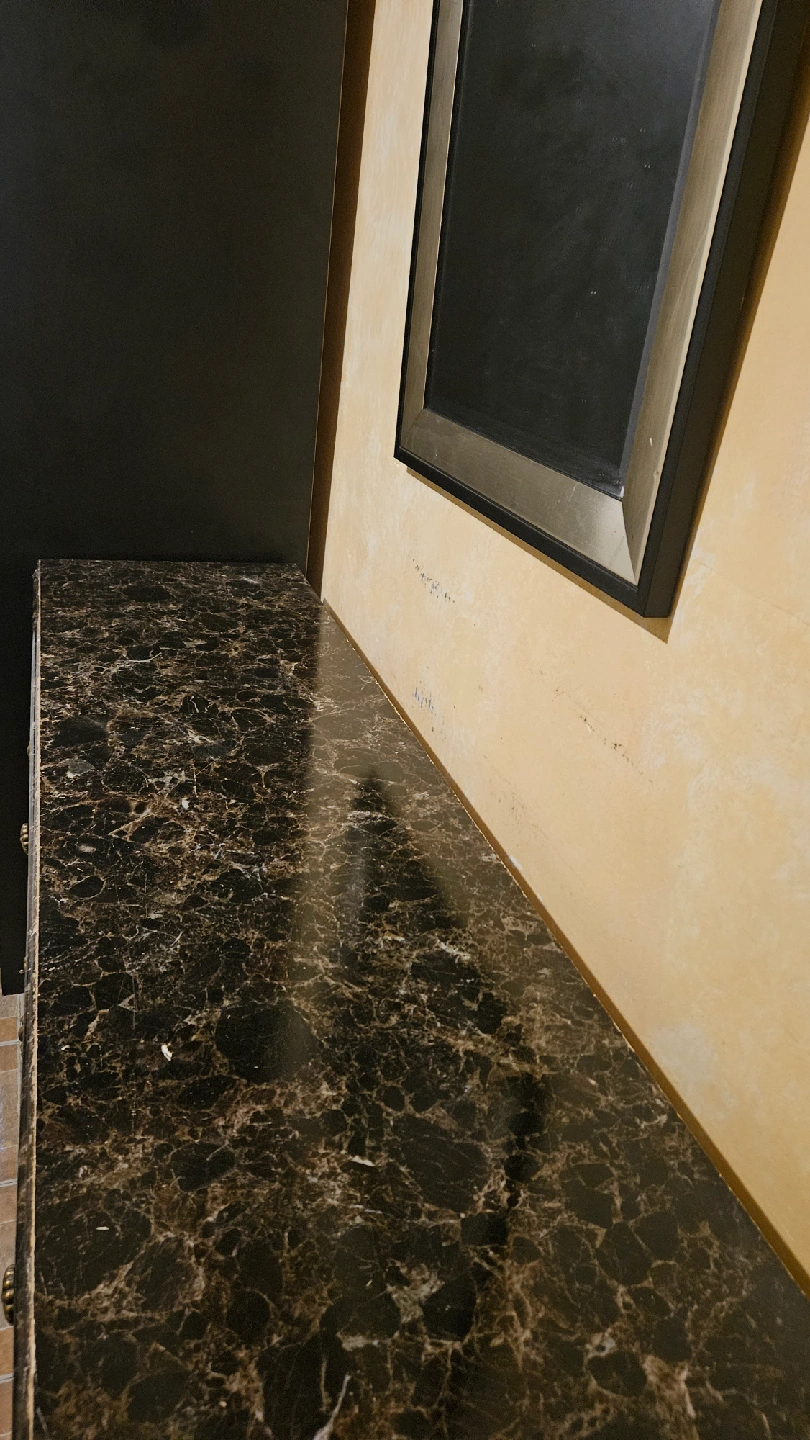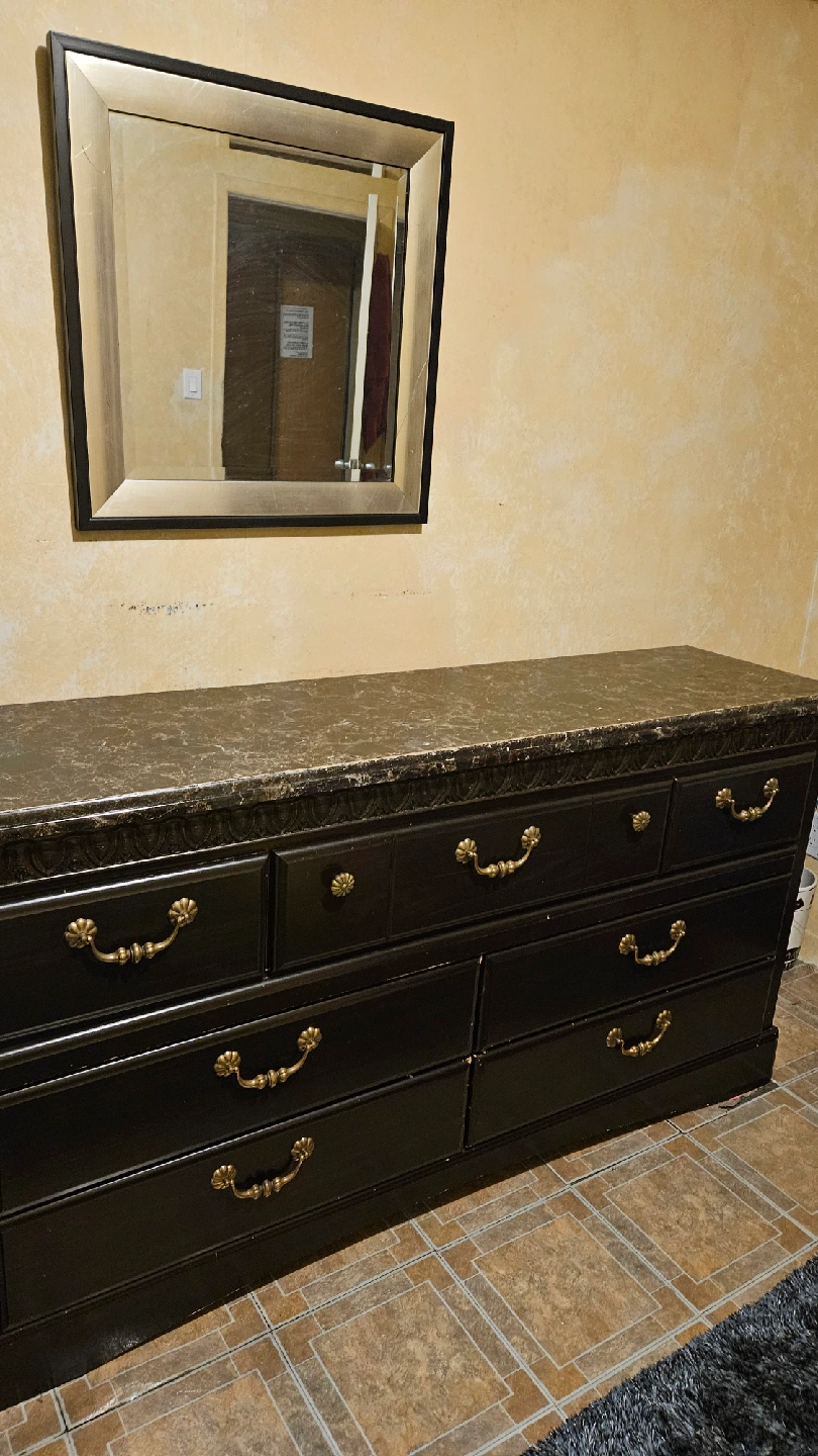 10Dark brown dresser with a faux marble top. It features ornate detailing and brass-coloured handles. There is some slight wear and tear on the edges, as pictured. Barely used. NON SMOKING NO PETS