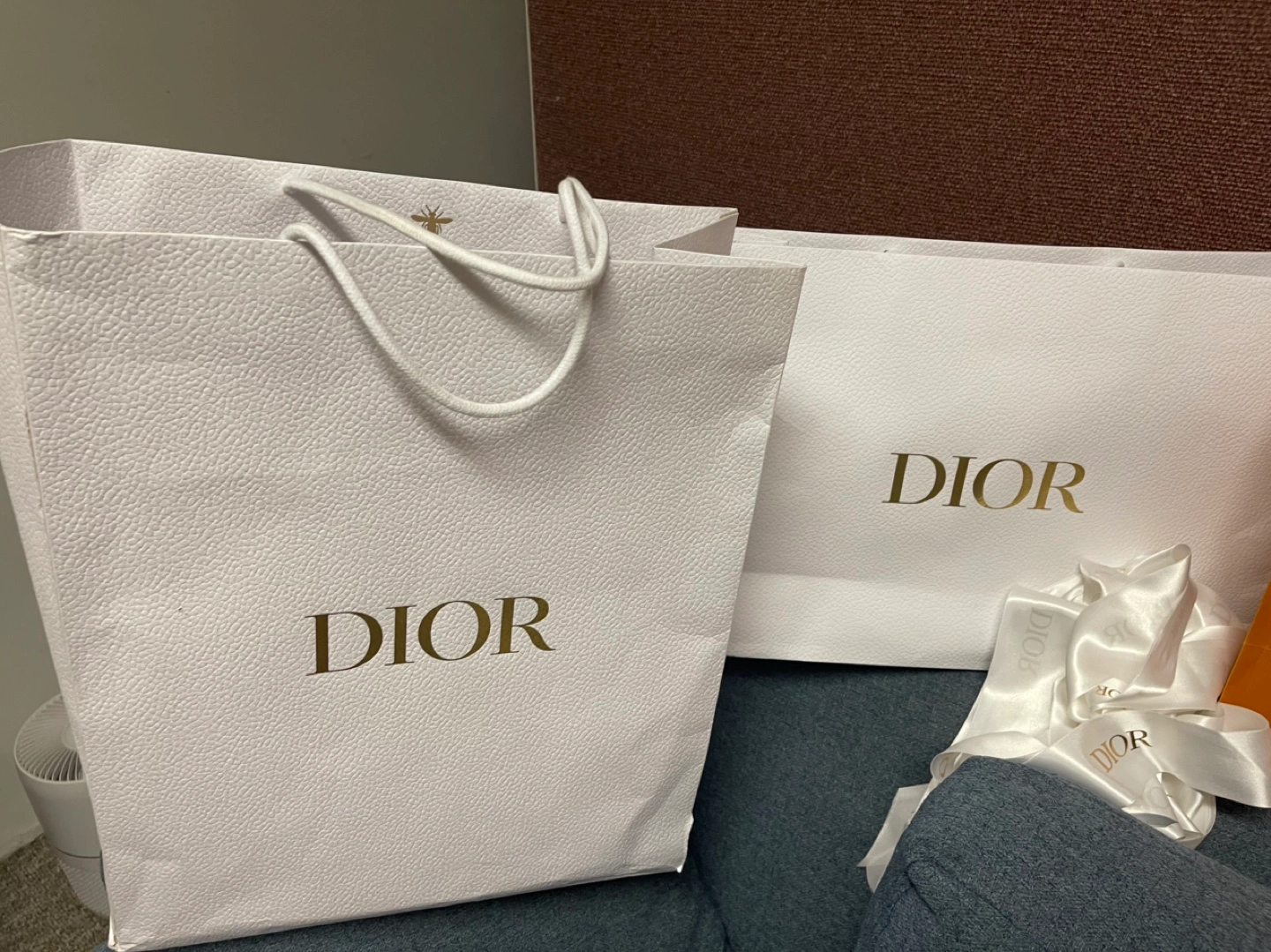 340Two white Dior shopping bags. One larger bag features a textured surface and a small bee logo. The other is smaller. Both bags show the Dior logo in gold lettering. Includes white Dior ribbon.