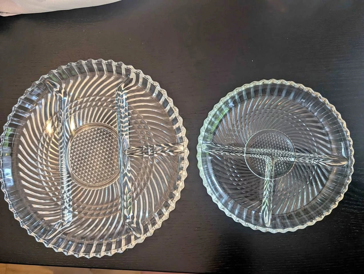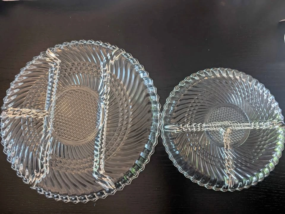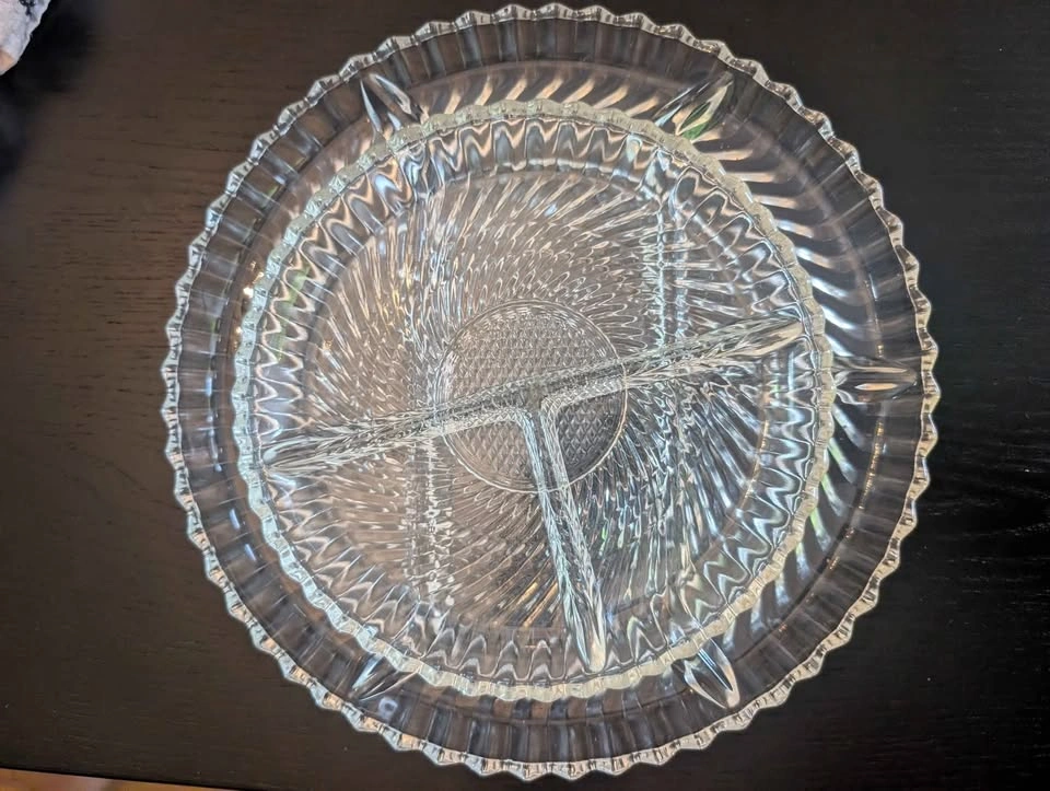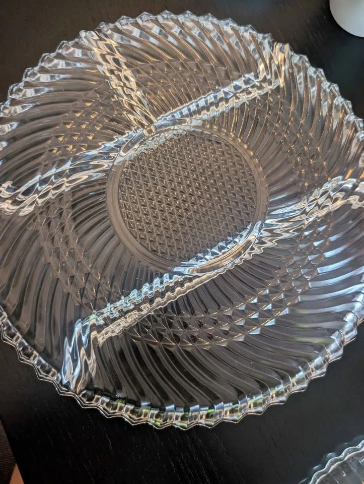 104 part divided serving tray (cracker) 3 part divided serving tray (relish) No damage Not sure the pattern, looks to be dominion glass company swirl pattern but not sure