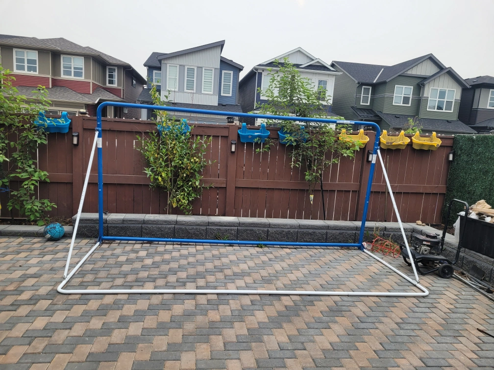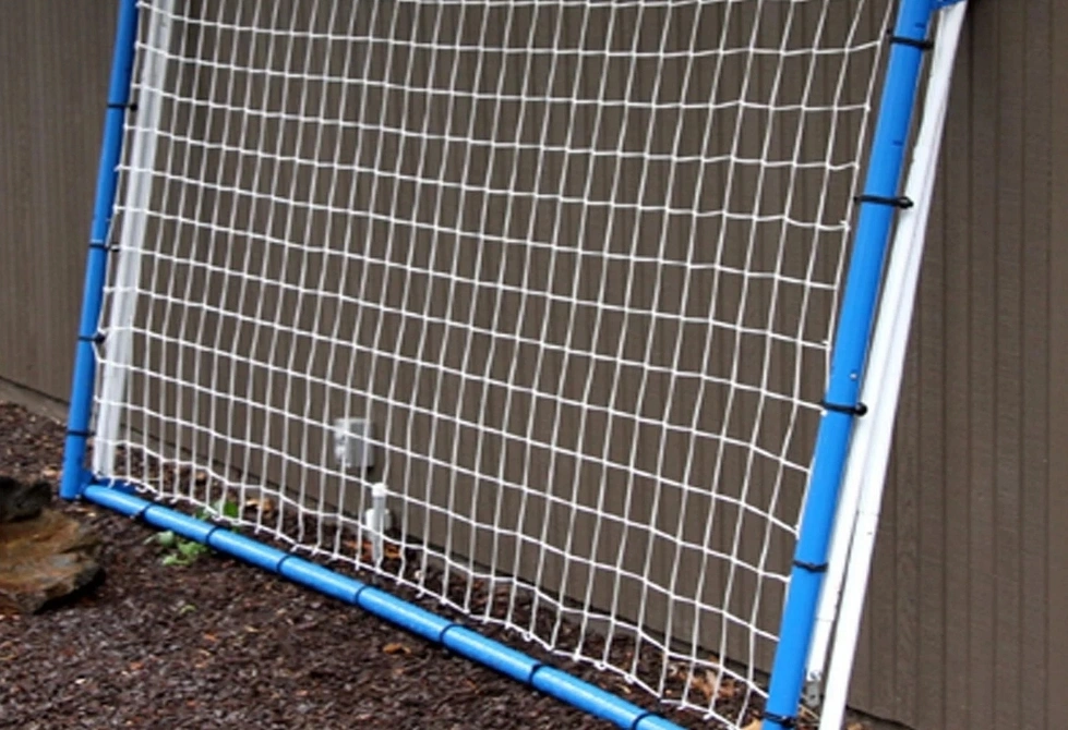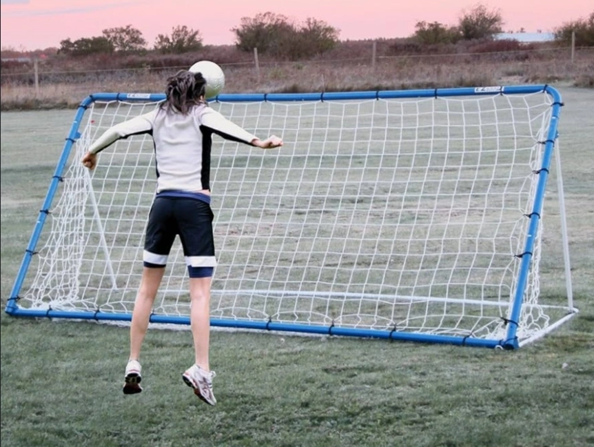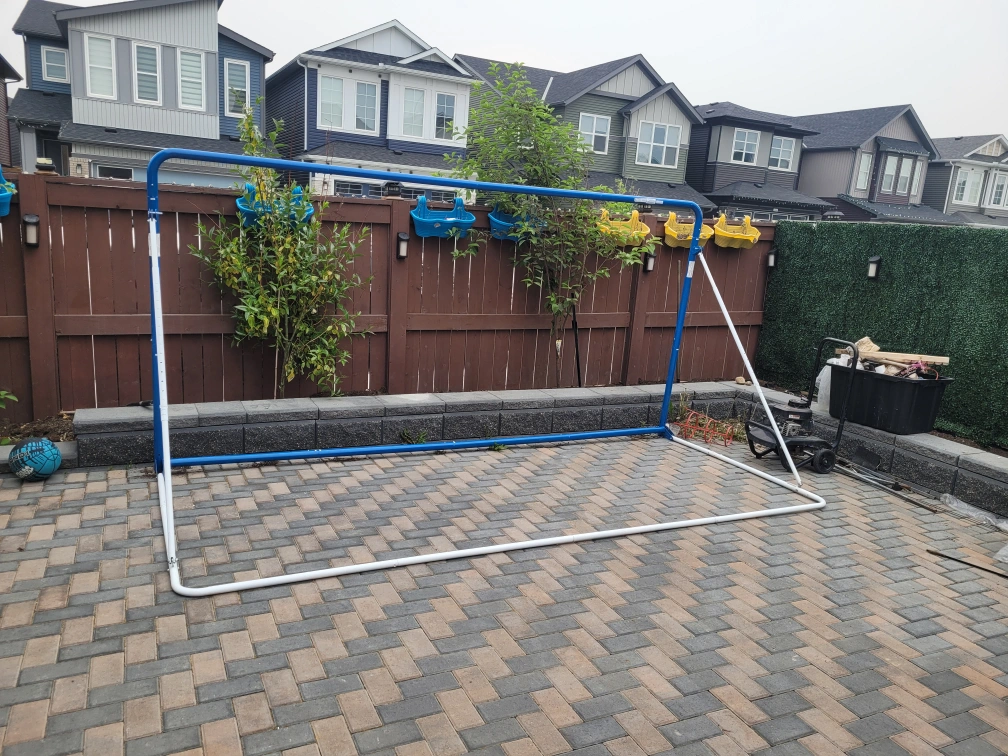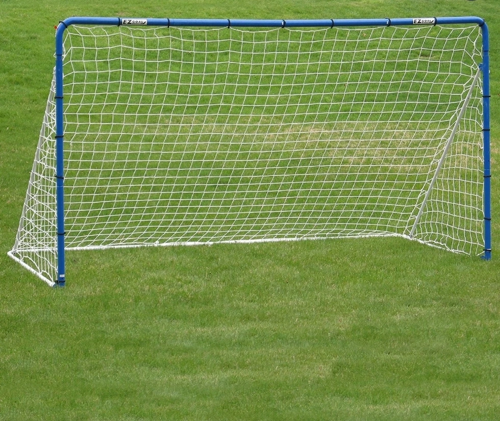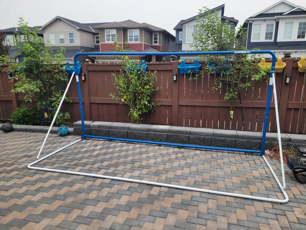 Blue and white soccer net. Square frame. Includes support beams. Imagine the fun you could have with this. It's a perfect item for a kick-around in the backyard. Selling two brand new 12ft x 6ft EZGoal soccer rebounders. Never used — only assembled for photos. High-quality steel frame, great for soccer, lacrosse, or general athletic training. Perfect for kids, athletes, or backyard practice. Never used – just set up to show what it looks like Super sturdy and durable (EZGoal brand) Great for training, target practice, or fun in the yard Easy to assemble and disassemble Price $190 per goal $390 for both (save $10) Located in [119 Carringsby Landing NW]. Message me if interested!