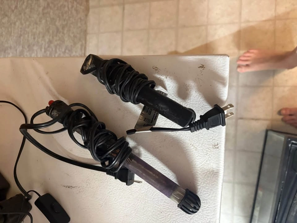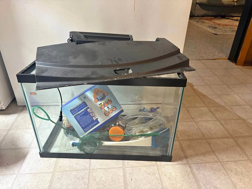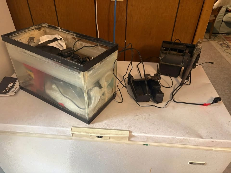 102 fish tanks with three pump filters 2 heaters assorted rock and decorations as well as suction cleaner 12x18x24 larger tank 22gal 8x10x16smaller tank 5.5gal