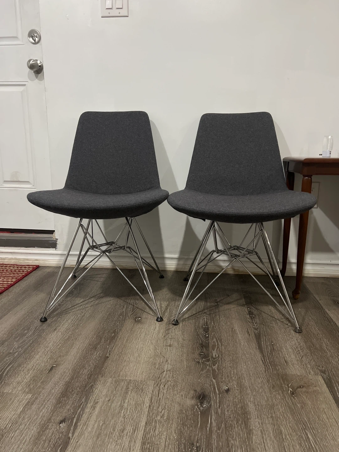 10Selling 2 comfy grey Eiffel style dining side chairs It has a sleek design with chrome legs. Perfect for adding a modern touch to your dining area or kitchen