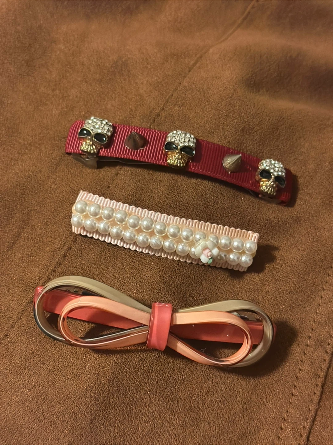 10Selling a set of three cute hair clips! They're in great condition and ready for a new home. One is red with skull and spike embellishments, another is white with pearl embellishments, and the third is a peach colour with ribbons