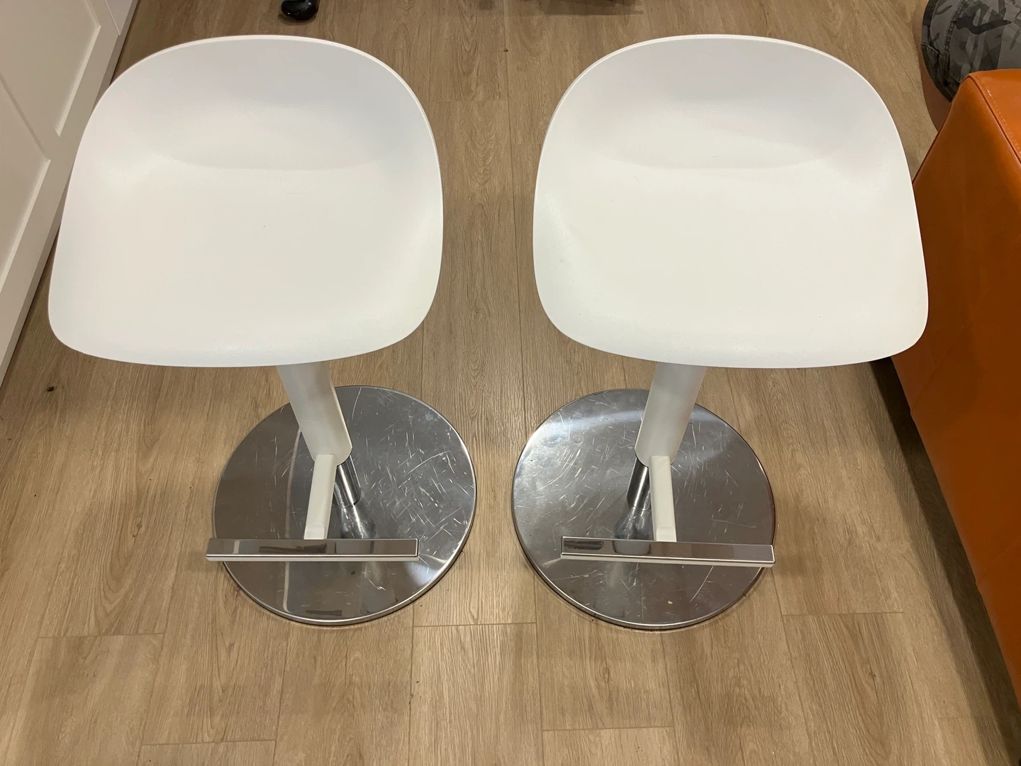 Selling a pair of white bar stools. They have a sleek, modern design with a chrome base. There are some signs of wear on the base, but the seats are in great shape! Perfect for adding a touch of style to your kitchen or bar area. Delivery may be an option with a fee.