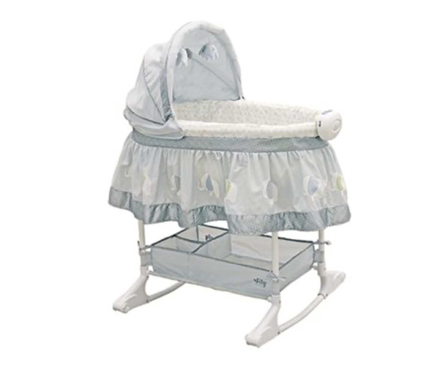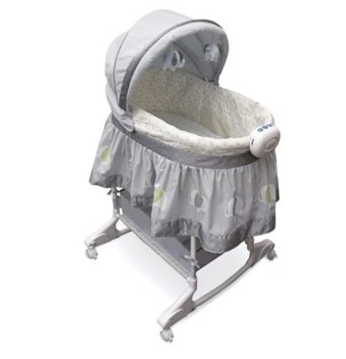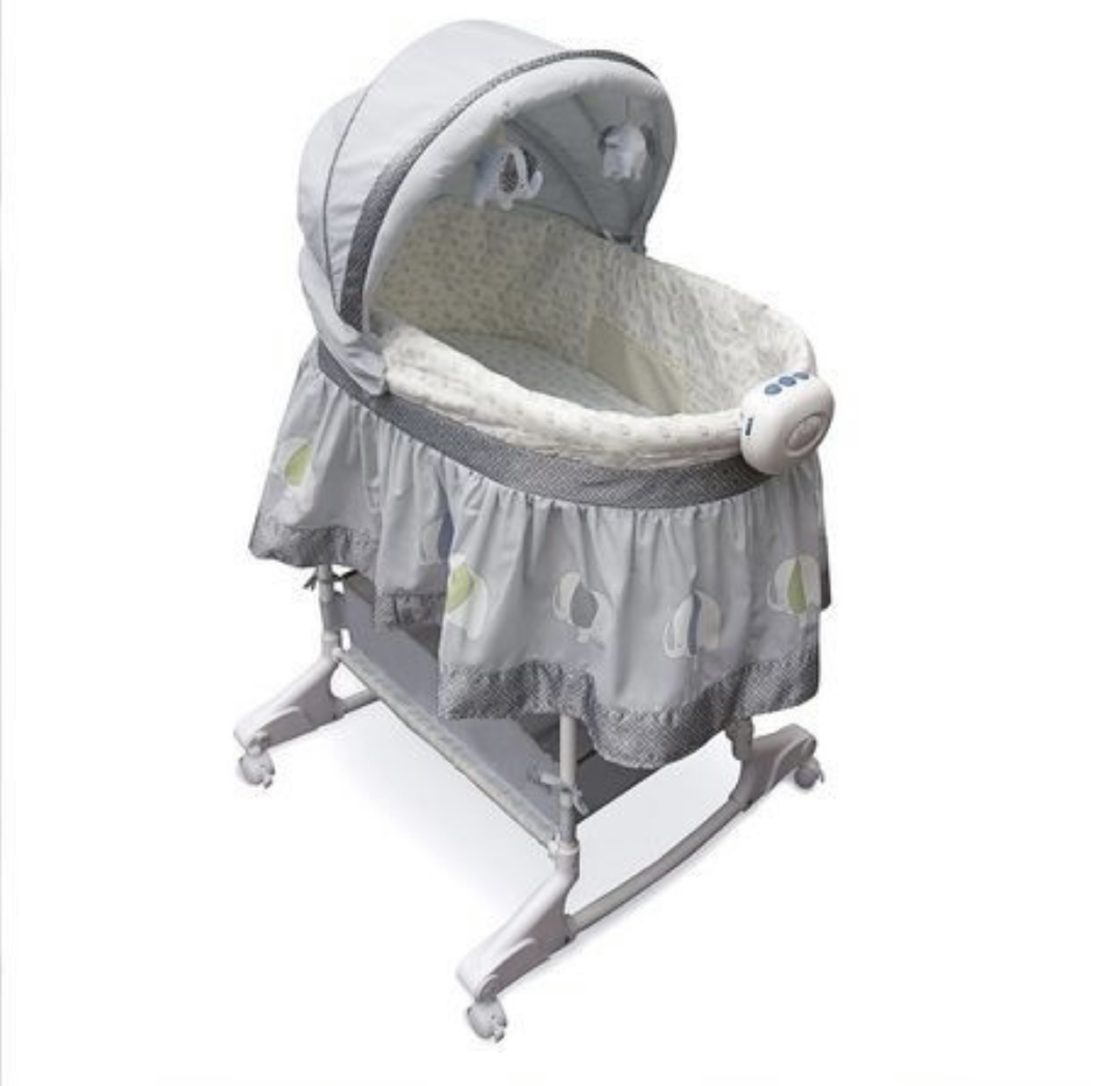 1000+2-in-1 Bassinet BY Bily Elephant Print - 0-3 Months, Stunning, Model # B4410EPN The 2-in-1 Bassinet by Bily helps keep your little one close to you, secure and extremely cozy day or night. Your precious newborn will be soothed with the comforting music, soft lights and very gentle vibrations. This bassinet is a rocker or converts to a stationary cradle with retractable casters and adjustable canopy. For Mom there is a large storage basket and for baby 2 soft toys. The 2-in-1 bassinet is the perfect solution for busy parents around the house as it offers a more mobile option to a traditional crib for the early months. Recommended use for babies unable to roll over, up to 18 lbs. and 3 months old or less Rocking or stationary bassinet converts to a cradle Adjustable canopy with 2 soft toys Comforting music, soft lights & soothing vibrations Large storage basket; retractable casters Requires 3 AA batteries (not included) Everything you see is included, even the crib sheet!! Amazing storage underneath the diapers!! Has wheels so you can push it around and it also rocks. SO So Amazing!! I 100% recommend it !! Pick up in the Lobby of my Condo, Located at Finch and McCowan in Scarborough