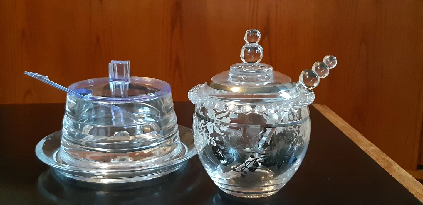 828Two lovely serving pieces...one vintage glass, the other modern lucite! 1. Vintage glass with lid and spoon (silver overlay) 2. Lucite with lid and spoon (By Alfio Di Bella of Italy)