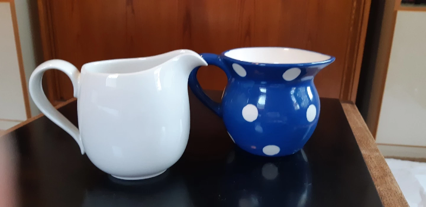 8282 creamers...one super-elegant, one super-cute! 1. Villeroy and Boch fine china 2. Casa Vero ( blue with white dots) Both are approx. 3" high.