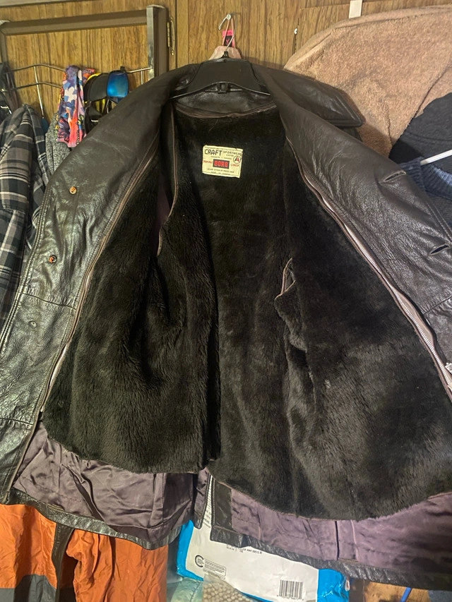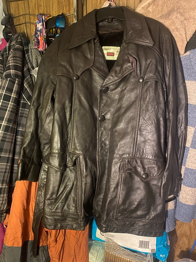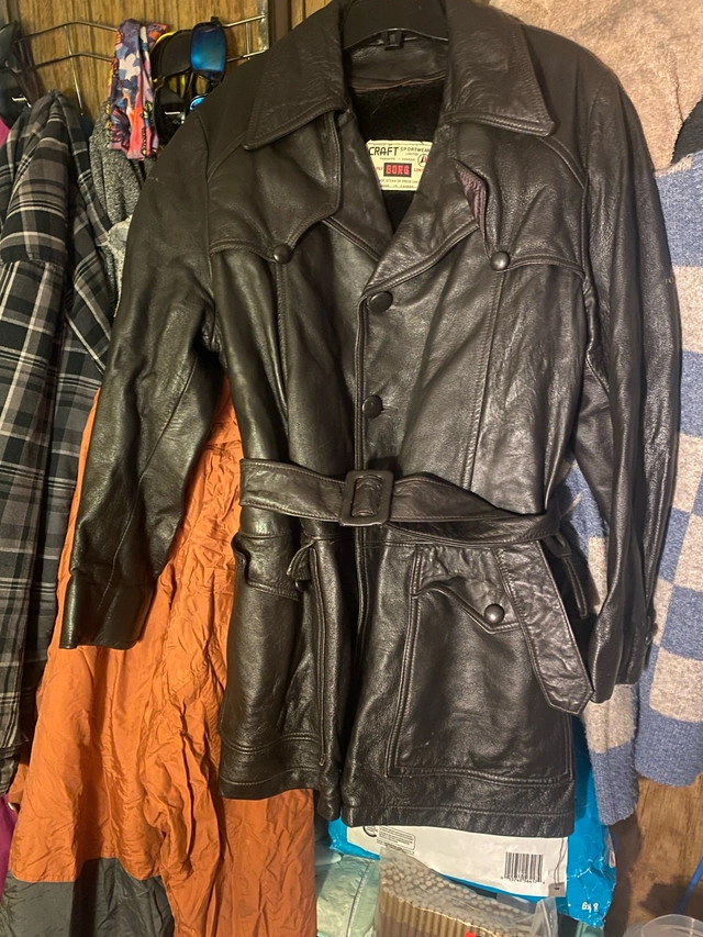 Selling two men’s vintage leather jackets with unique character and style. The first jacket is a black Craft-Air genuine leather jacket with a belted waist and faux fur lining, perfect for colder weather. The second jacket is a black leather jacket, size medium, which has the cool worn-in look you would expect from a vintage jacket. These jackets are in fair condition with wear consistent with their age, adding to their vintage appeal. If the ad's up, the jackets are available – no need to ask! Grab these before they’re gone!