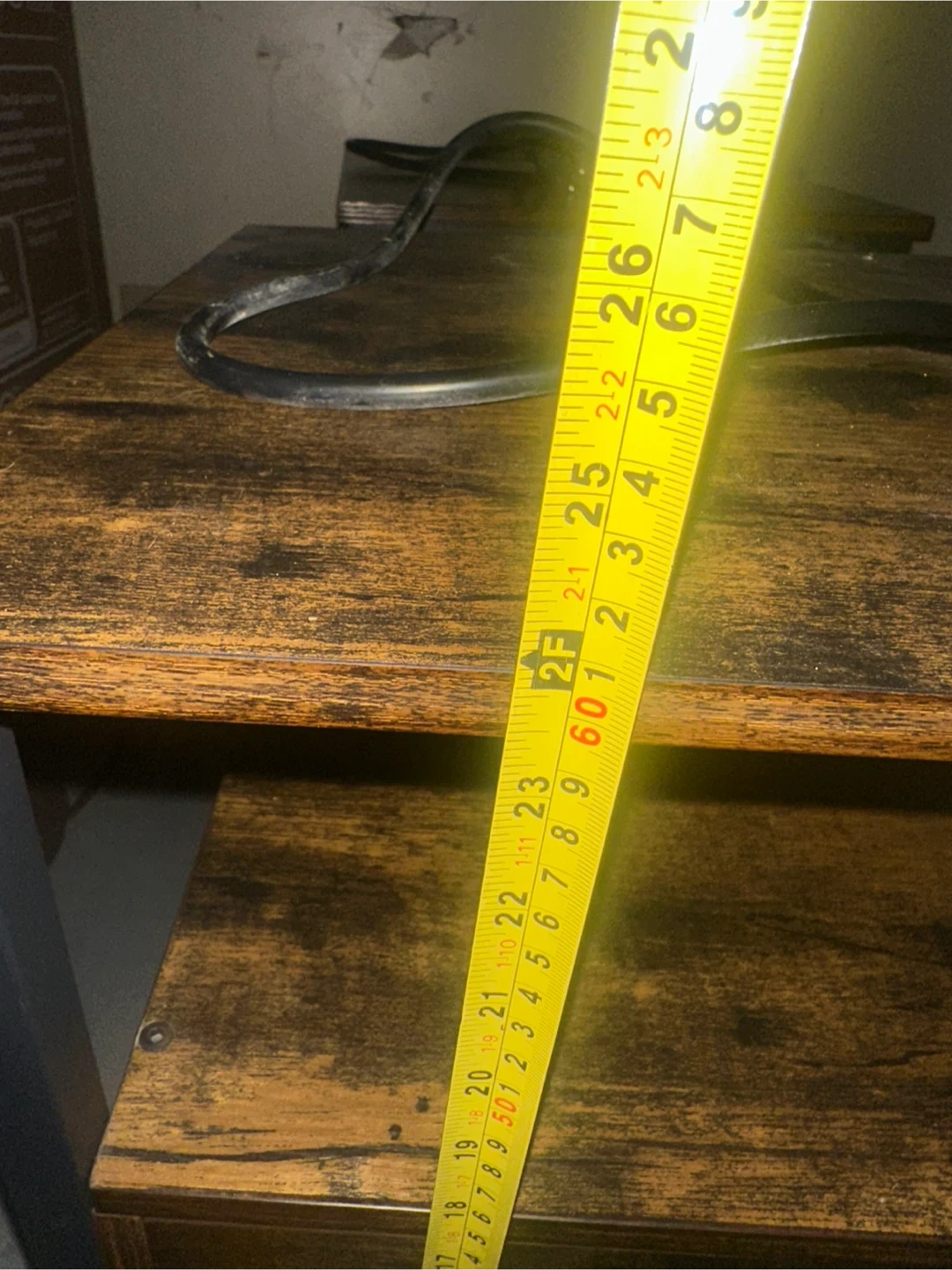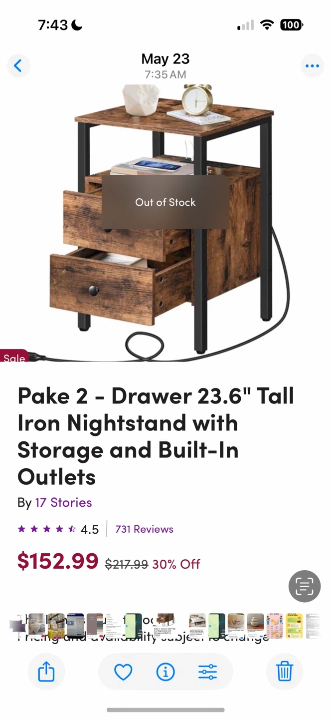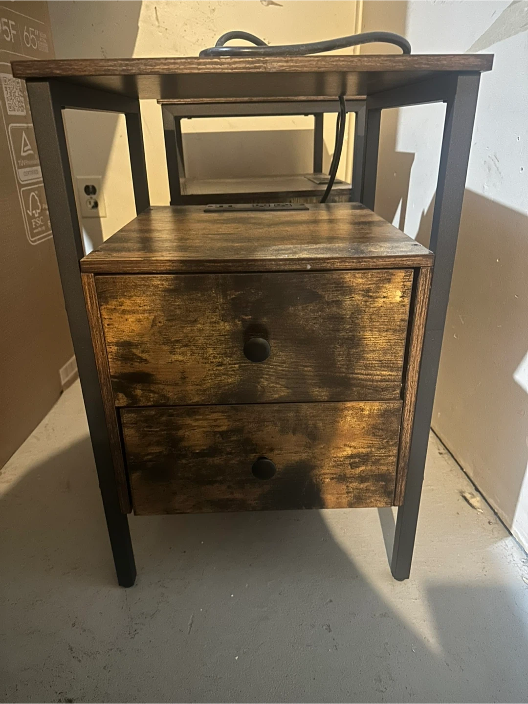 10Selling 2 Pake 2-drawer nightstand from 17 Stories! It's 23.6" tall and has a built-in outlet. The nightstand has a rustic look with an iron frame. It measures approximately 16" wide. Selling as a pair.