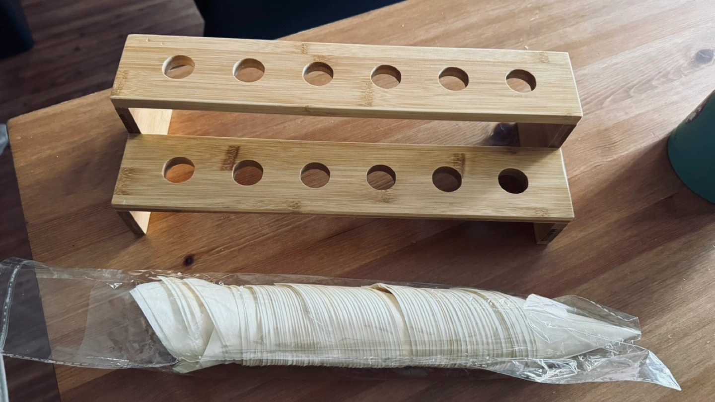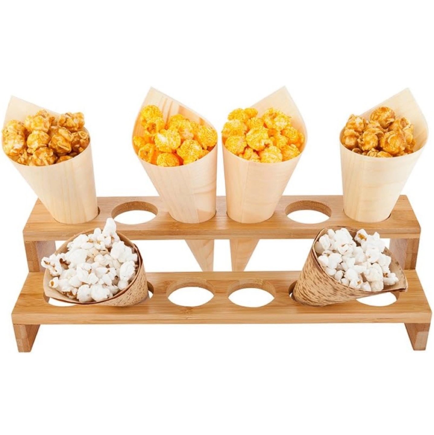 2 PACK NEW Two-tiered bamboo popcorn cone holder. Holds twelve cones. Includes fifty plain paper cones. Perfect for parties and events.