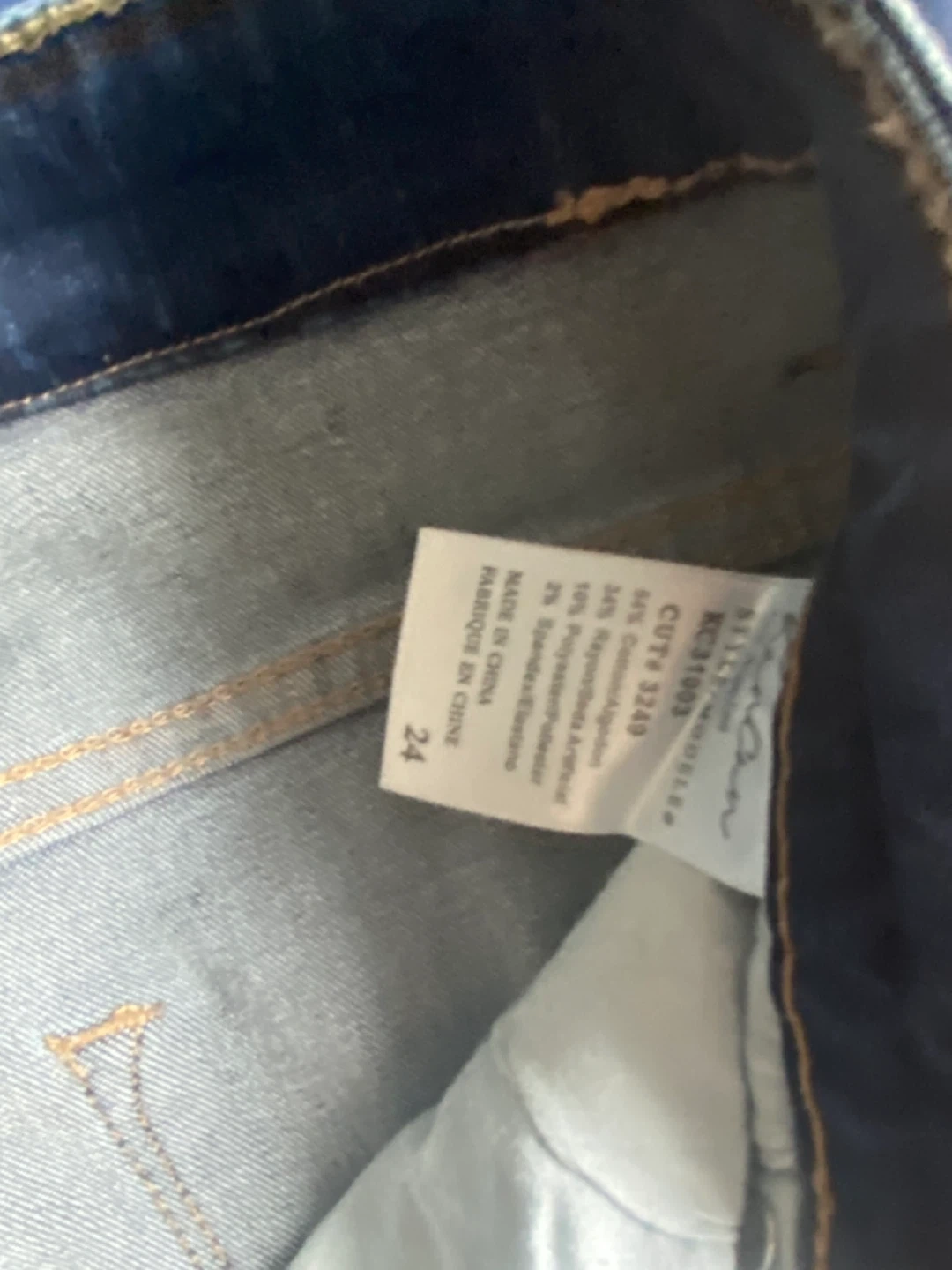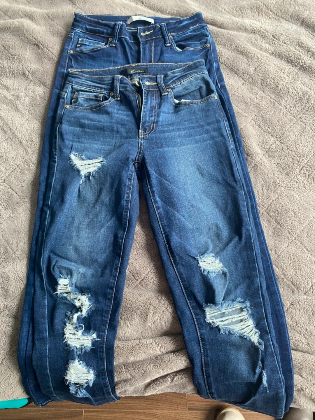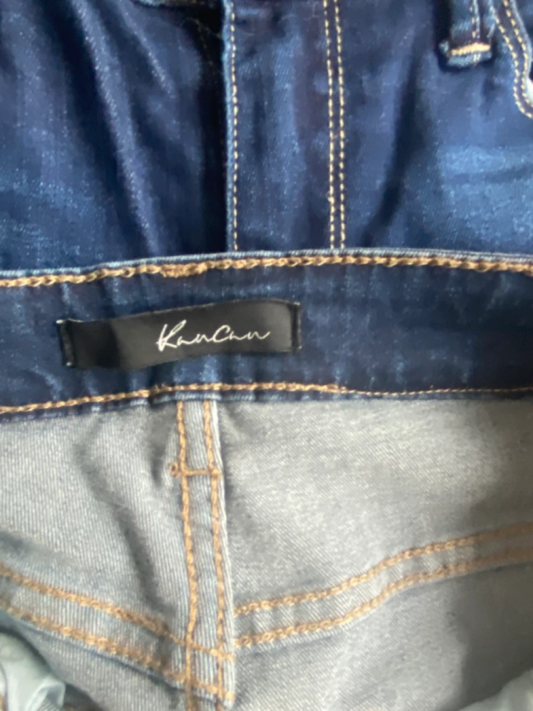 15Selling 2 pairs of KanCan jeans in size 24. They are dark wash denim with a ripped design. The material is a blend of 54% rayon, 26% cotton, 19% polyester, and 1% spandex