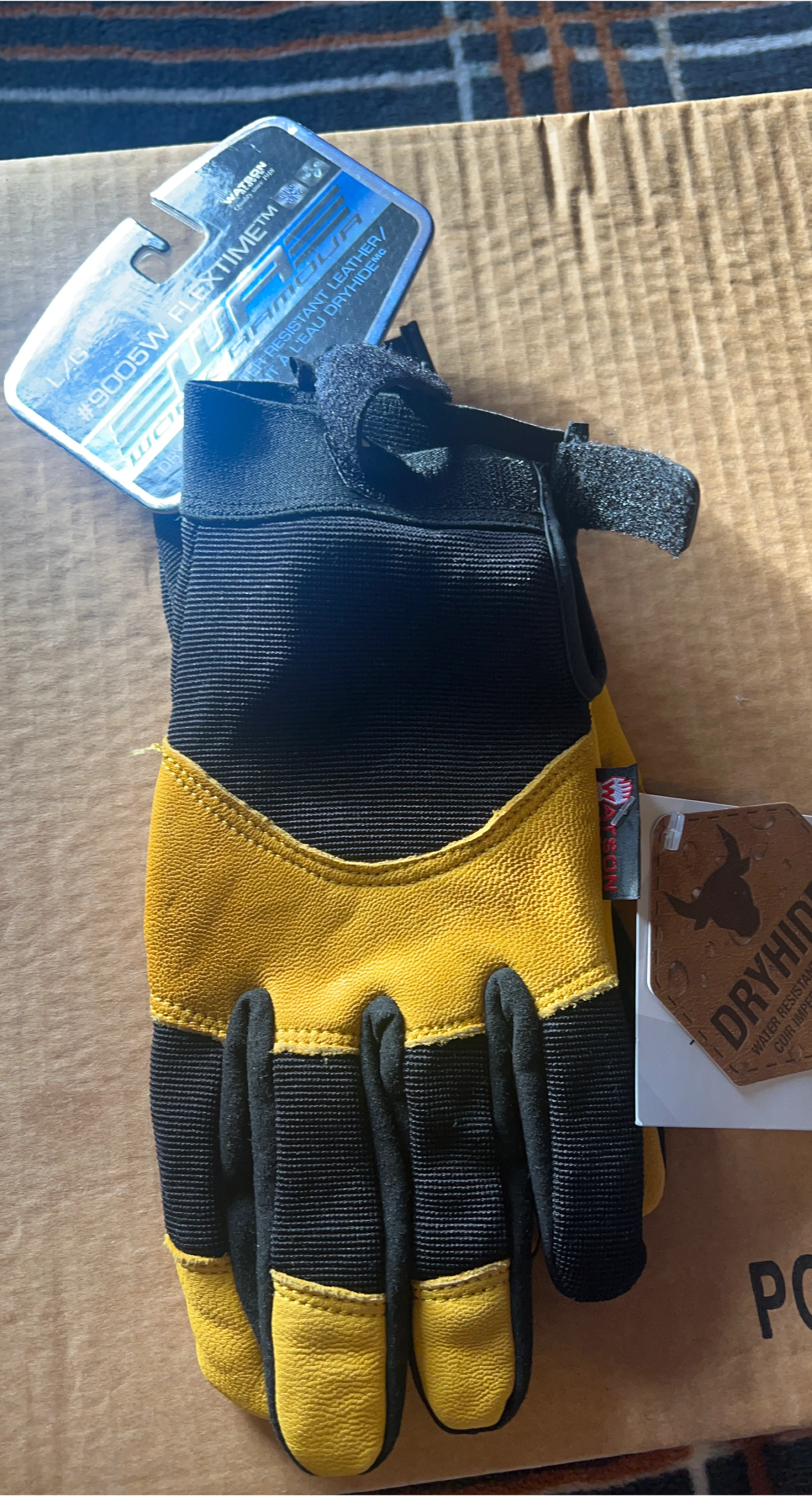 Selling a pair of Watson Flextime work gloves, size large. These gloves feature water-resistant leather and Dryhide technology, keeping your hands comfortable while you work. They're in great condition and ready for a new owner!