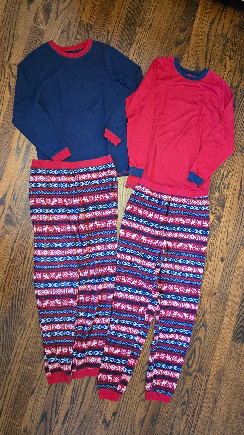 142Cozy up with this Weatherproof Vintage pajama set! The set includes a long-sleeved top and patterned pants. The material is a blend of 60% cotton and 40% polyester. Size 14Y but fits more 12Y