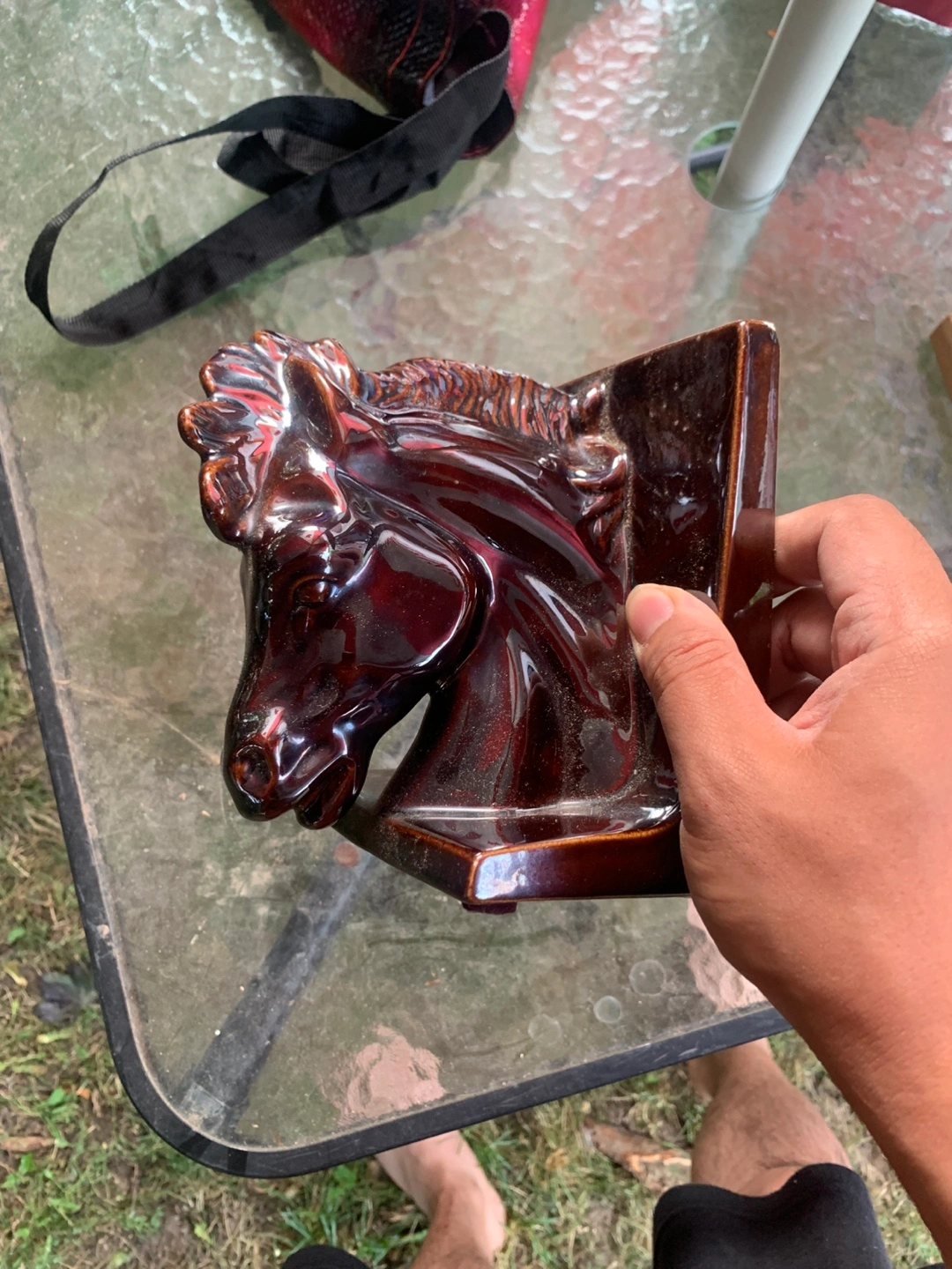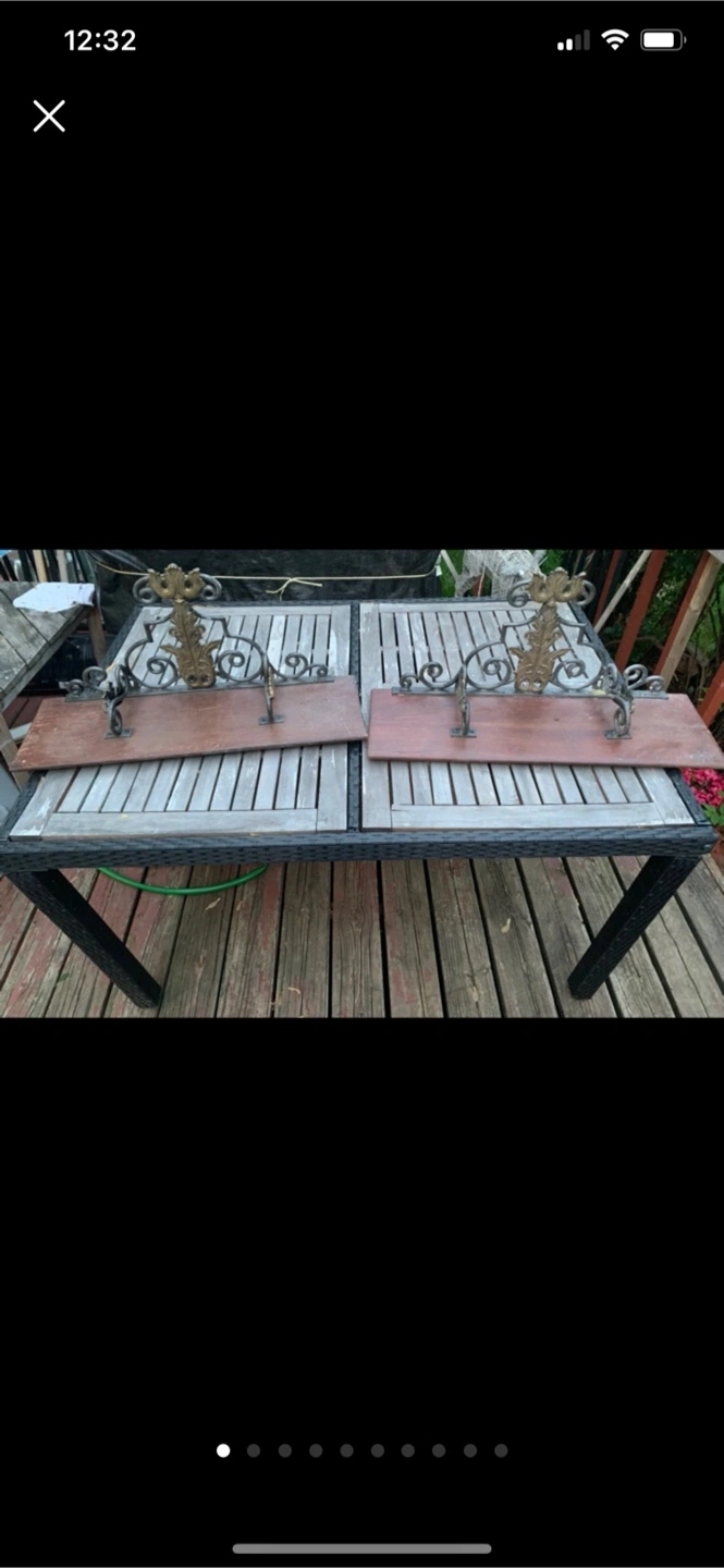 3232 Piece Antique Dark wood Shelves and Horse Books Stand 2 Piece Antique Dark wood Shelves with Gold embroidery and a matching Horse themed books stand Beautiful antique dark wood shelves with beautiful artistic designs. Gold embroidery designs mixed with black and rich dark wood Comes with both shelves and the horse book stand Perfect for adding a touch of vintage charm to your entryway or bedroom! The horse book stand is used to hold books, paper, magazines, binders, notebooks up without falling down Cheap - message me Can be picked up or delivery