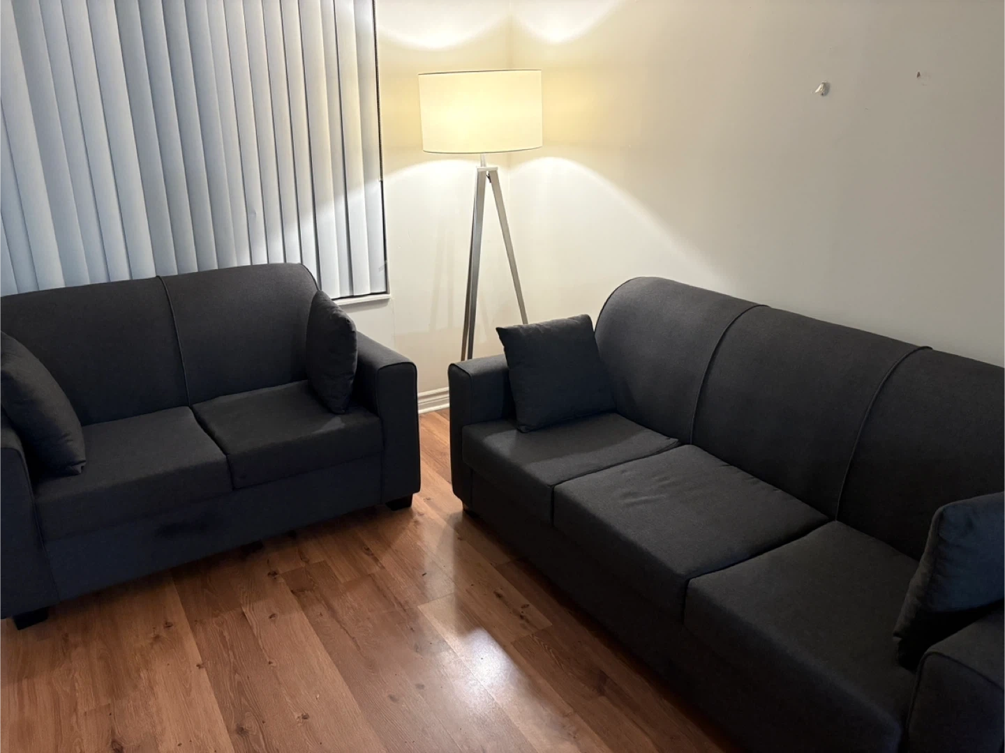 88Selling a comfy grey sofa and loveseat set! They're in great condition, extremely clean and ready for a new home. Perfect for a living room. **From a Pet-free home. These come with 4 side cushions as well. We bought it just few months back, however we are moving back now, so selling it. They are like new only, no stains nothing.