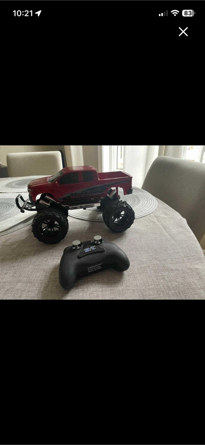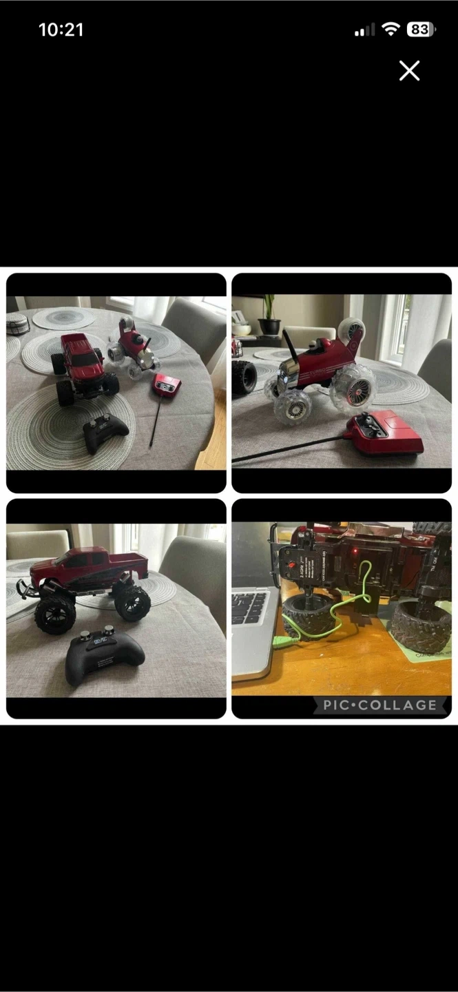 102 RC vehicles - good used condition always stored inside. Red Truck - has on-board USB charging cable for truck. Remote uses 2xAA batteries (not included) Vehicle with clear tires- has headlights, there’s a wheel on top you can tip car upward and drive on it. Takes 4xAA batteries in the car and remote takes 9V battery (not included) Selling as a lot Cash only. No e-transfer Porch Pickup no meetups