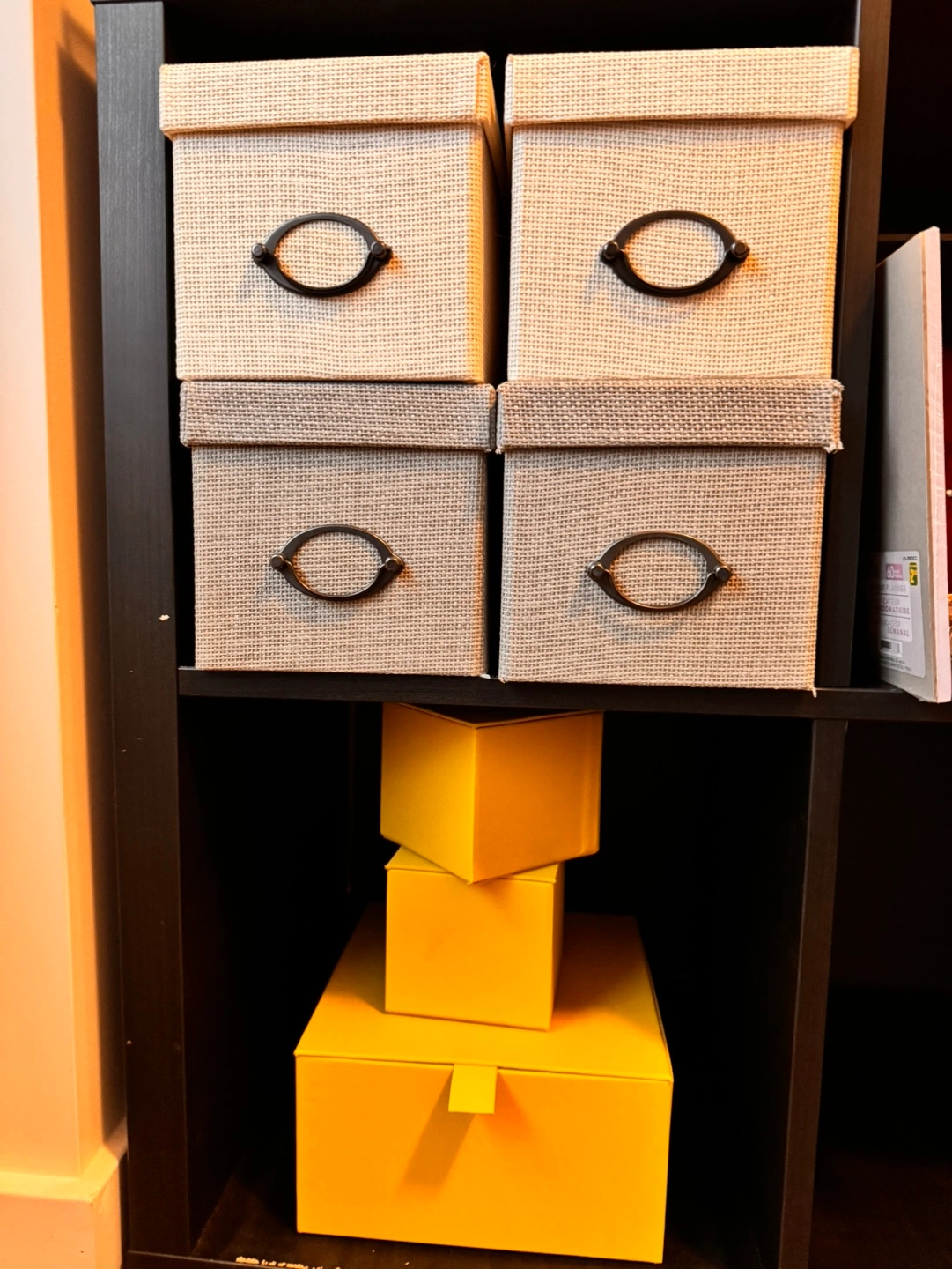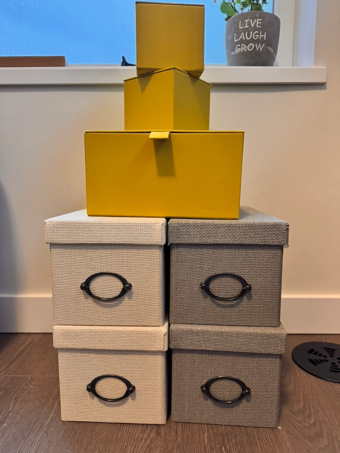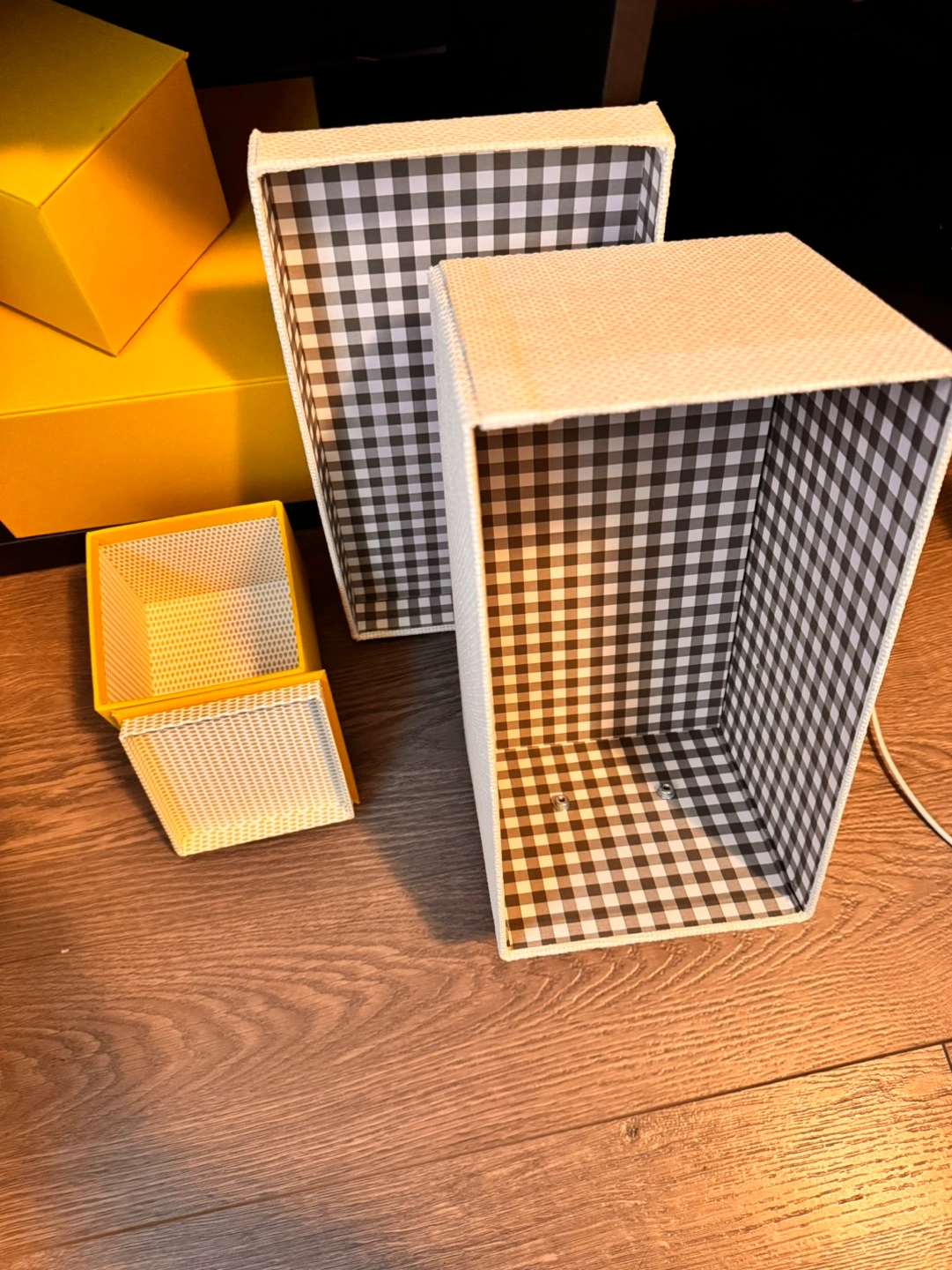 Storage boxes with lid from IKEA. Gray/beige 16cm x 29cm x 15cm made from woven paper on the outside and extra touch with a check-pattern lining on the inside. Three yellow cardboard boxes. 22cm x 22cm x 12cm & 10.5cm x 10.5 x 10cm. Great for organizing and storing small things.