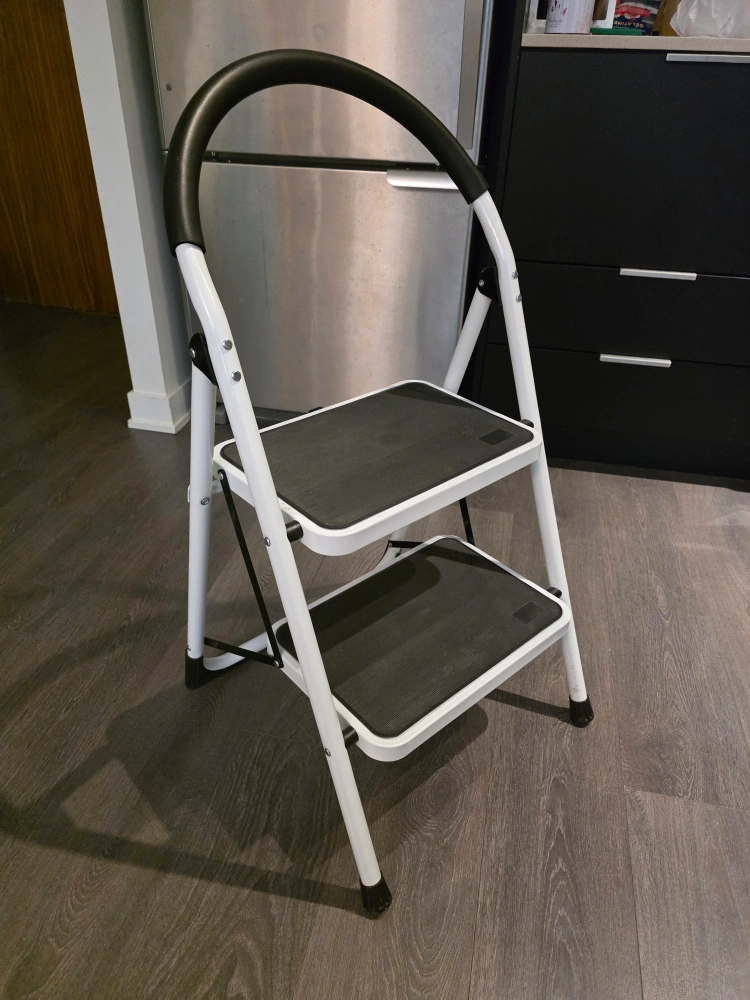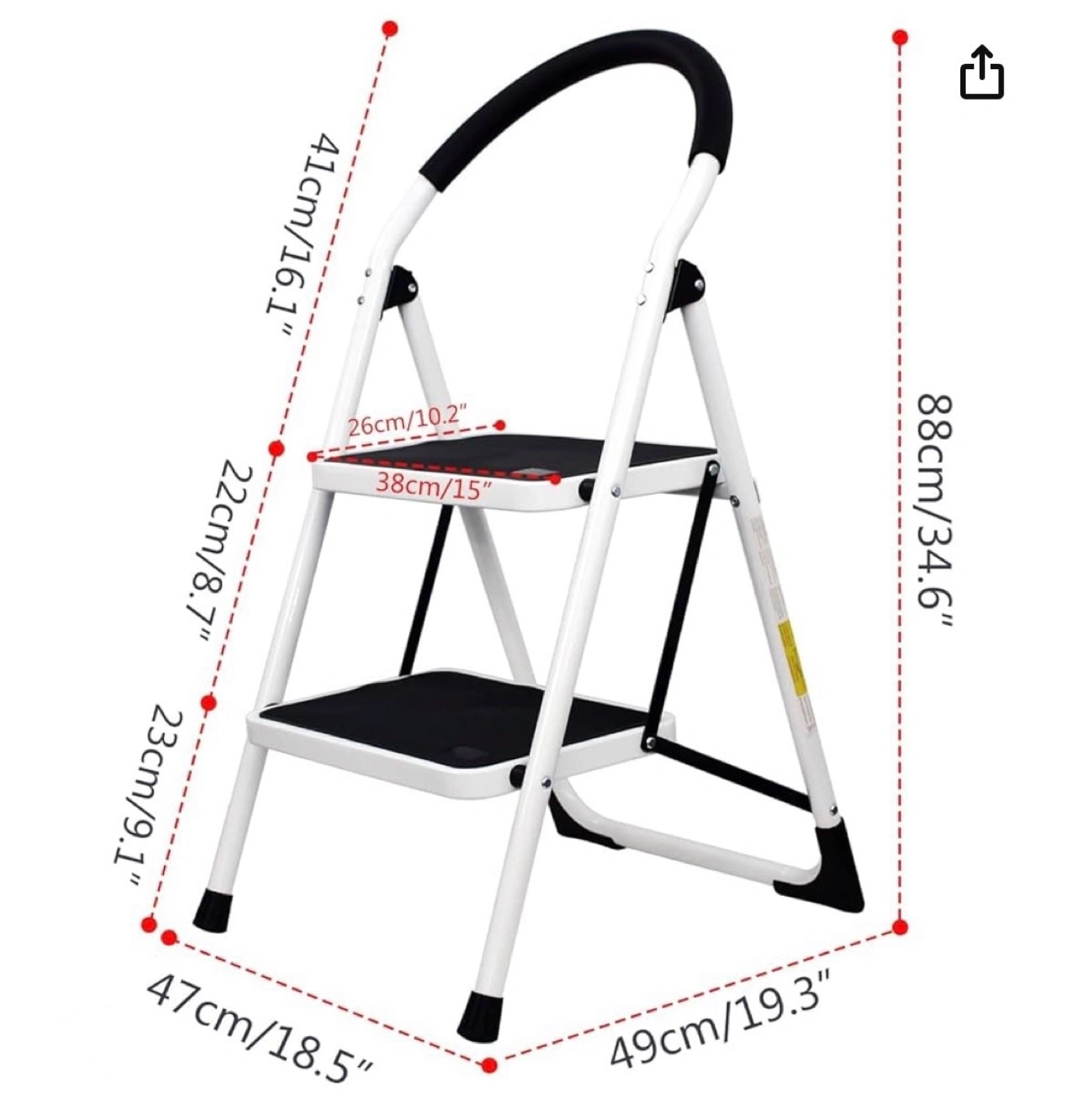 290White folding ladder with black rubber feet, a black handle, and two black platforms. The ladder has measurements in both centimetres and inches.