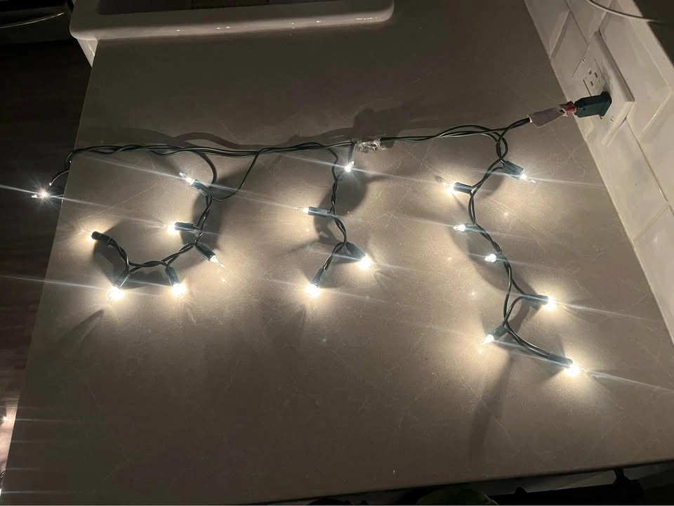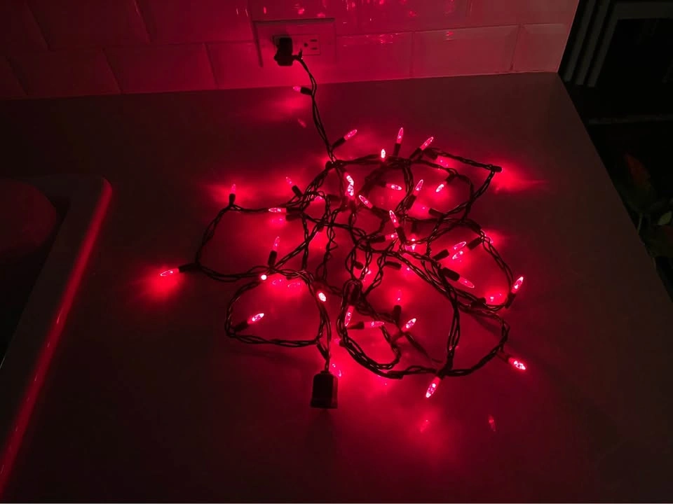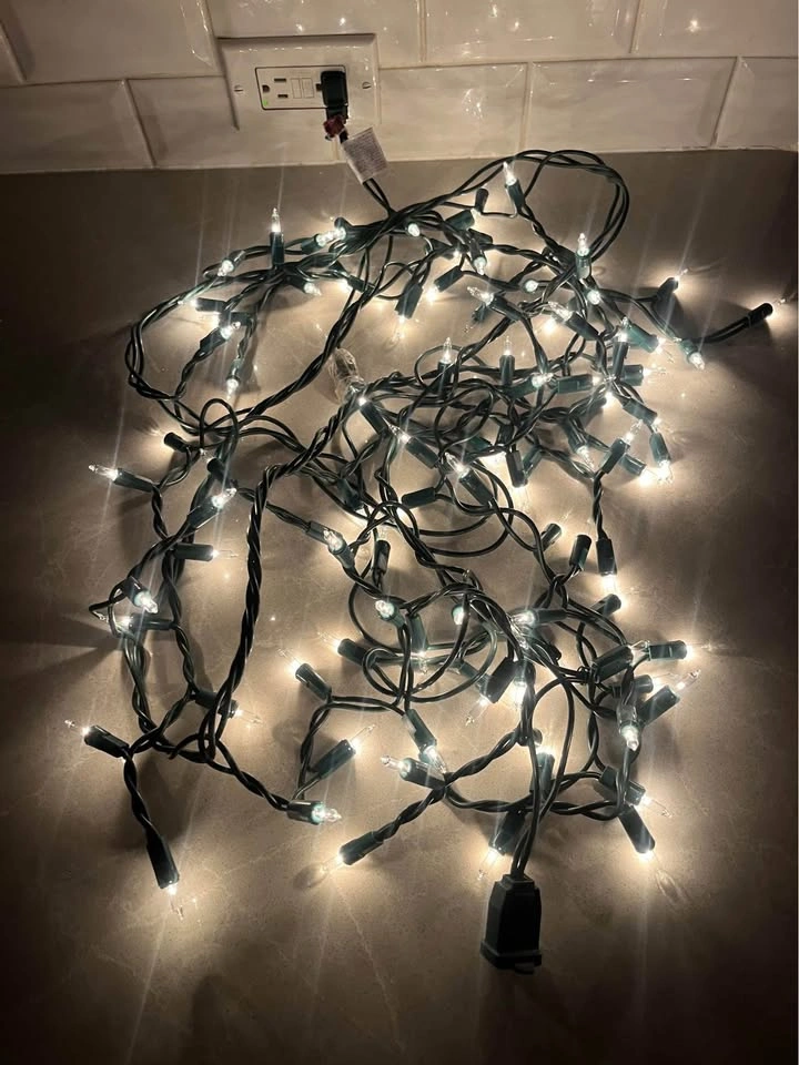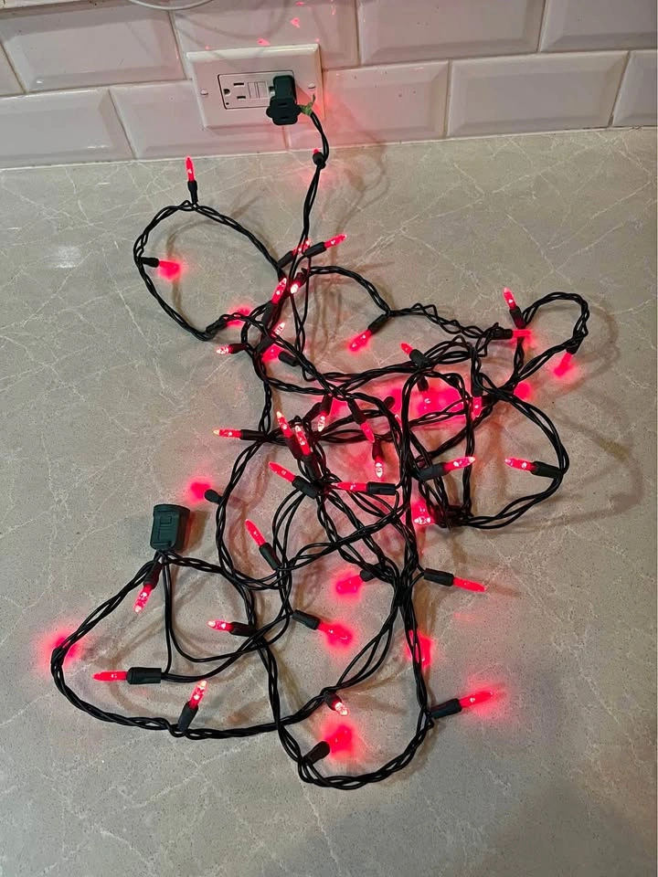 10Two strings of Christmas lights: 1) 9’ white icicle lights, incandescent, exterior 2) 16’ red, interior, LED. Price is for both together.