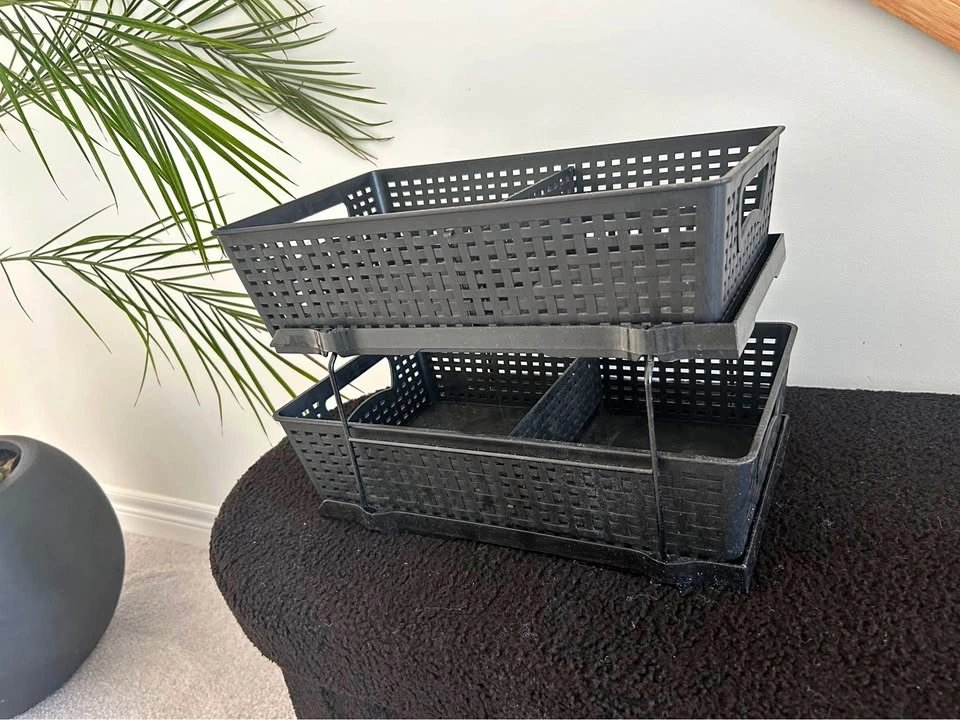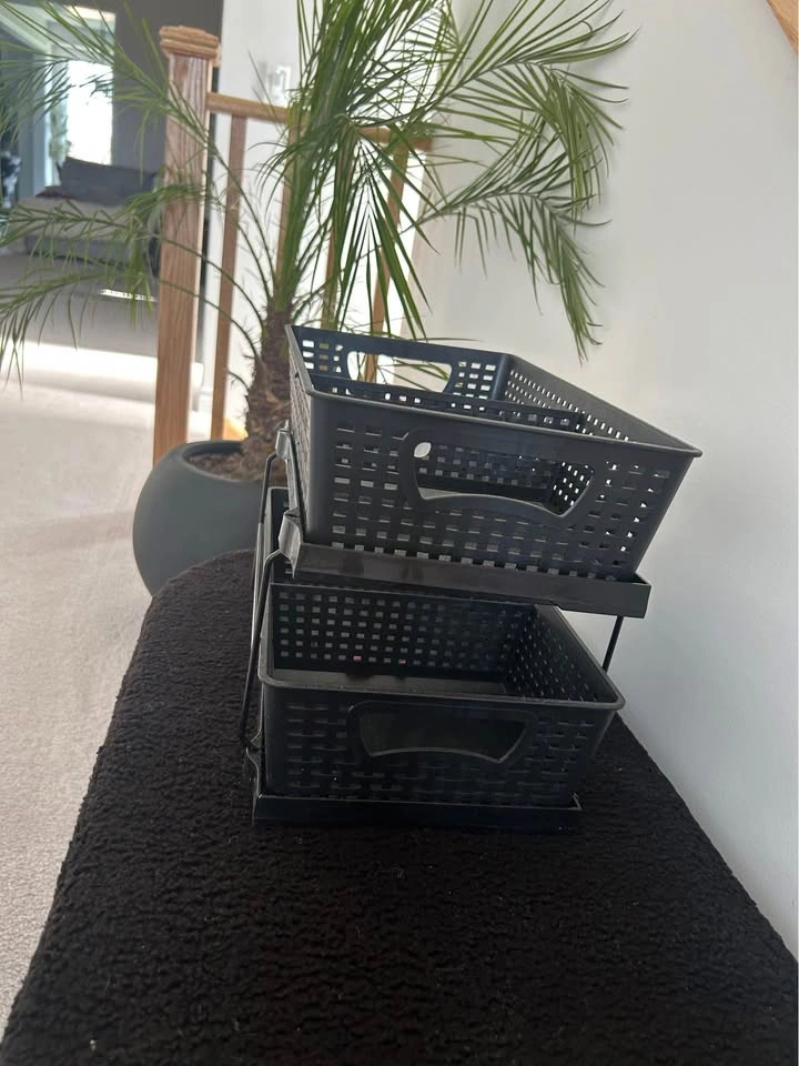This black basket organizer is new and perfect for decluttering your space. It features two tiers, providing ample storage for various items, from office supplies to kitchen essentials. The baskets are made of durable plastic and the frame is sturdy metal. This organizer is a stylish and practical addition to any home or office, helping you keep things tidy and accessible. Its sleek design complements any decor, making it both functional and aesthetically pleasing. If the ad is up, it's available!