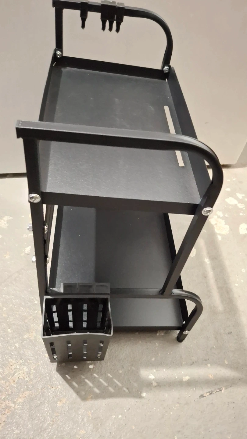 1000+Here's a handy black metal 2 tier organizer Has a side container, removable hooks and a side rail Base is 8.5"x12" Height 15" Top is 6.75" x 12"