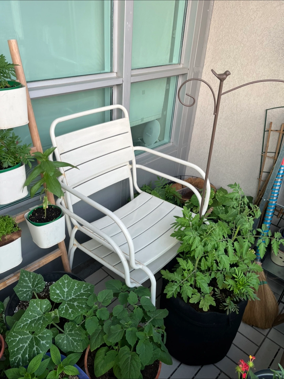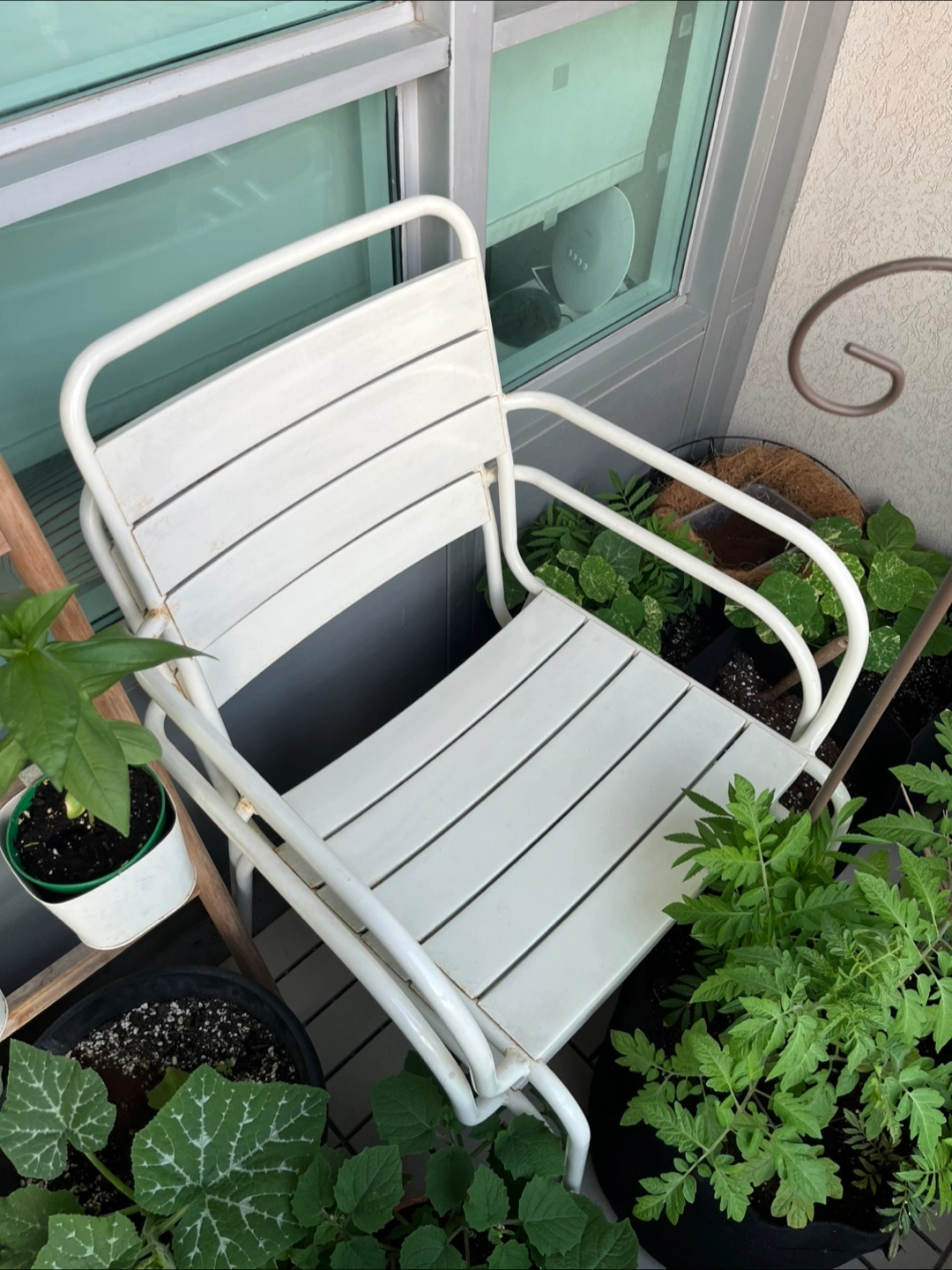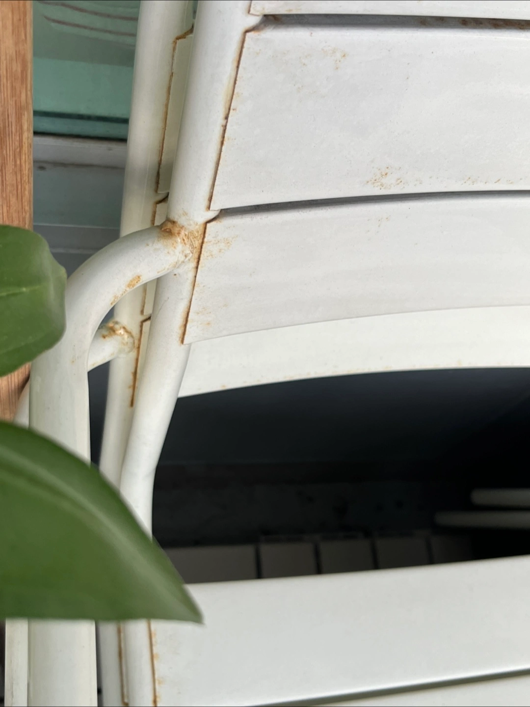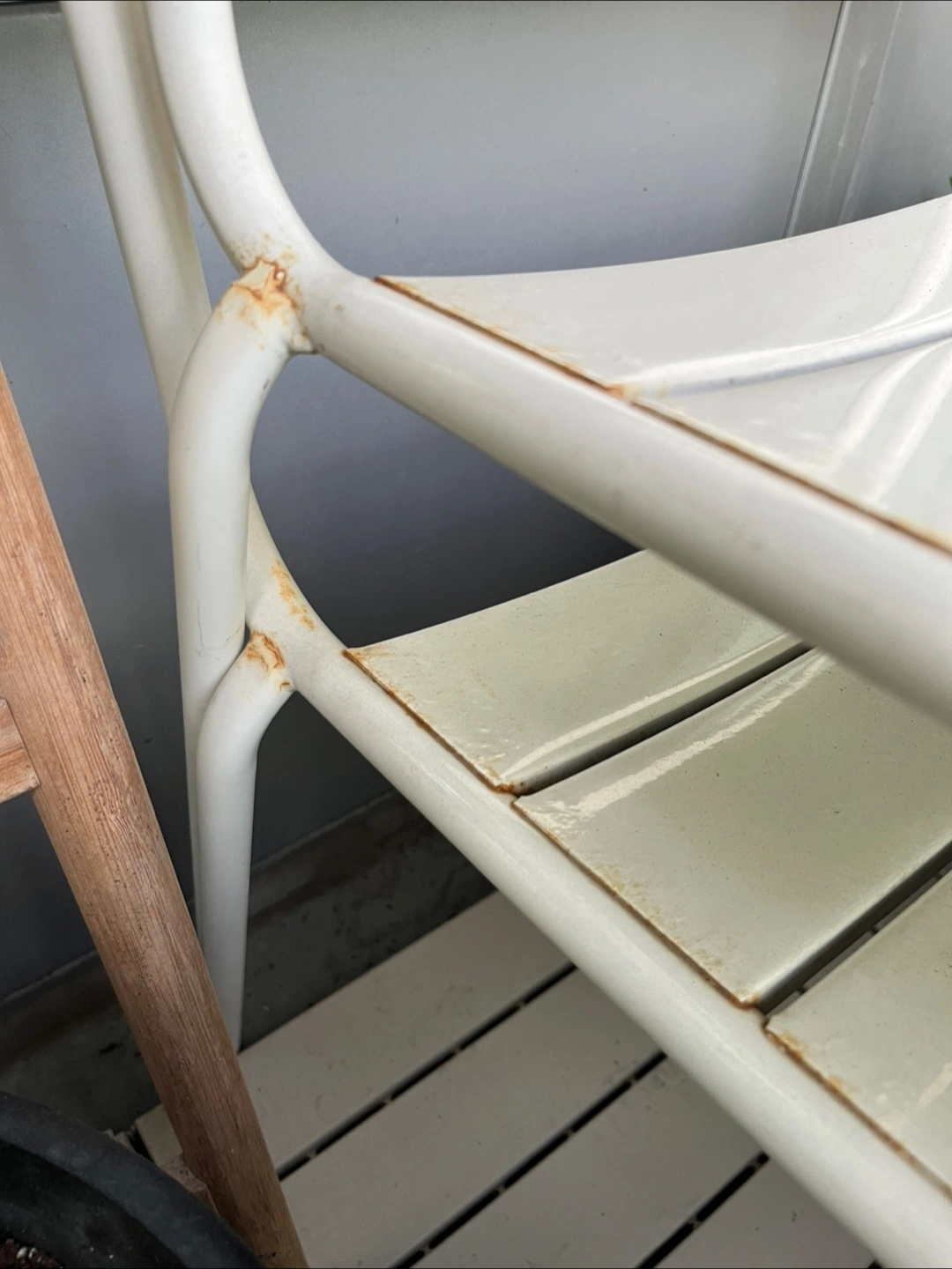 White metal patio chairs with a slatted seat. Some rust as shown in photos.