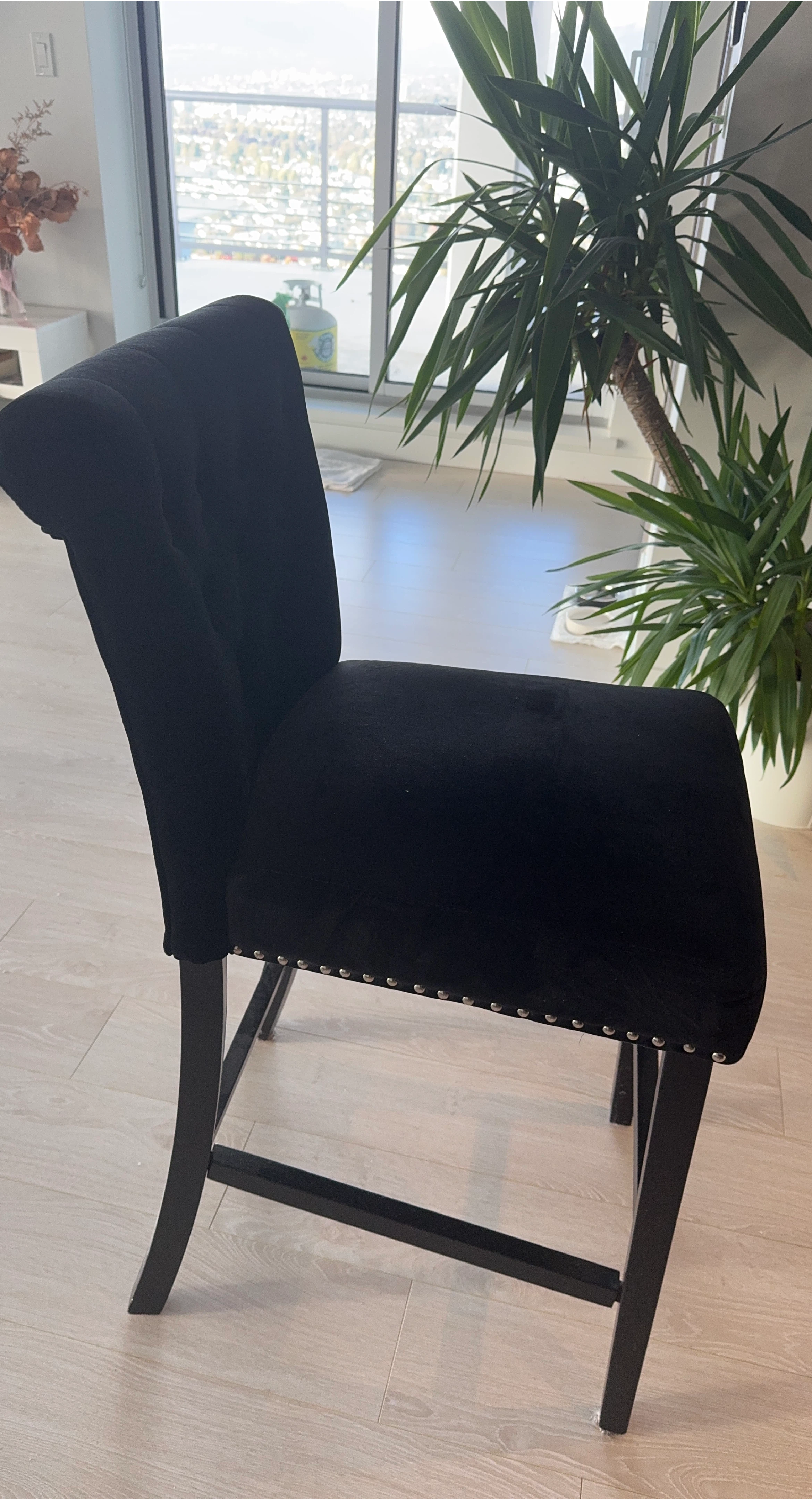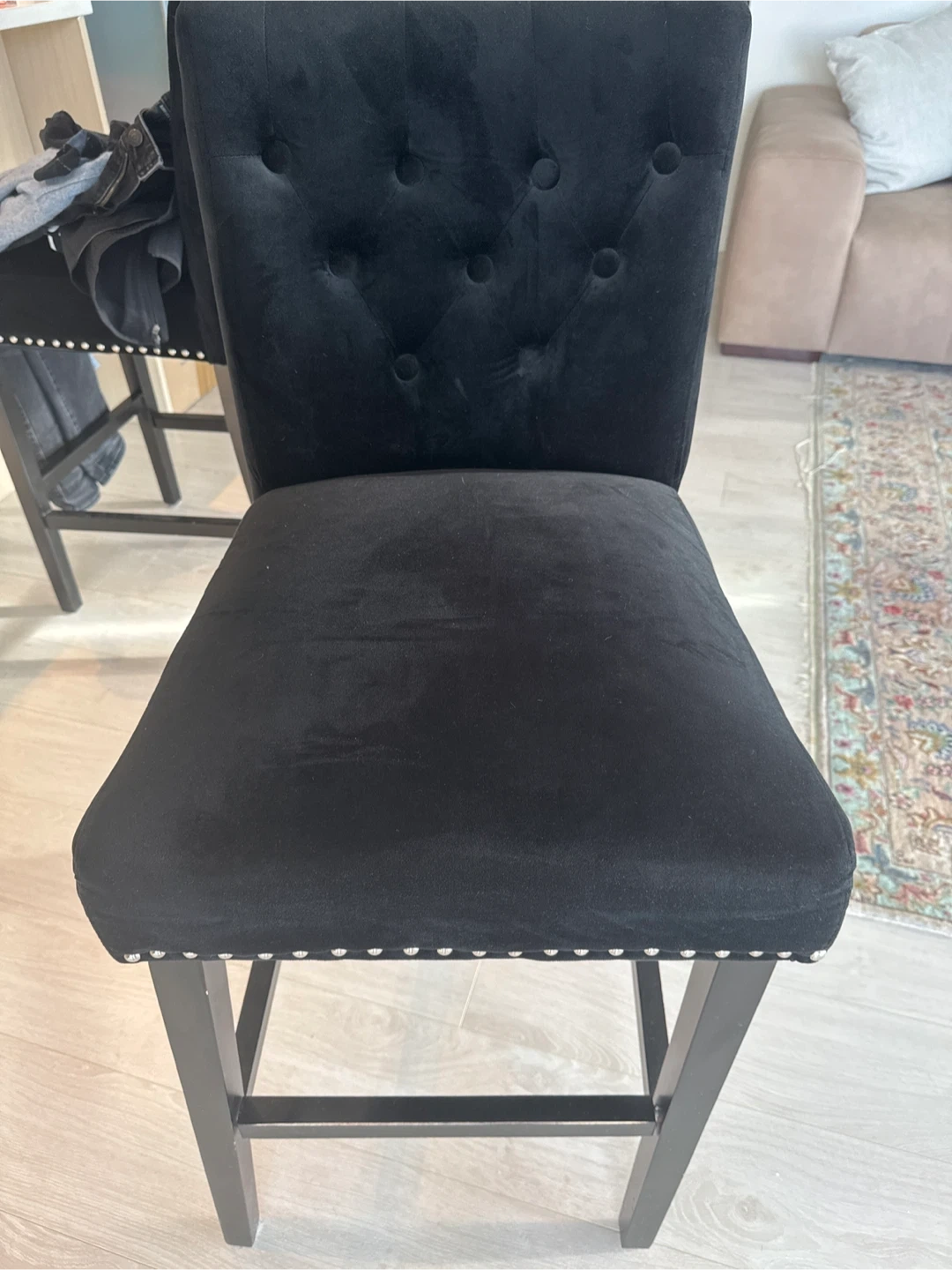 10Selling 2 x stylish black velvet bar stool. It's in great condition and would look amazing in any kitchen or bar area. The velvet material adds a touch of elegance, and the stool is very comfortable to sit on. Perfect for adding extra seating to your space. They are a bit wobbly, but that should be easily fixable.