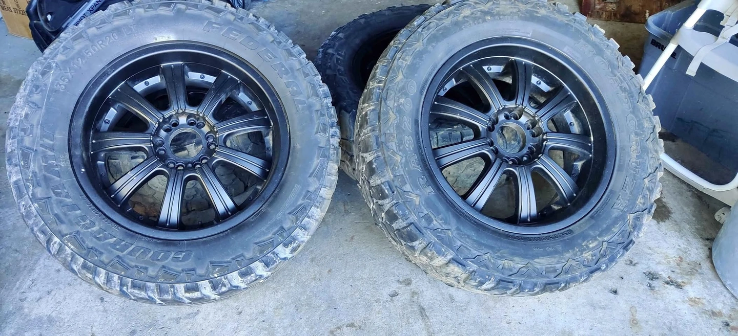 18Sending a pair of 20 inch rims. Comes with 35 inch mud tires 35x12.5x20. Fits f150 with a dual bolt pattern. One tire needs replacing, one is decent, and two are good.