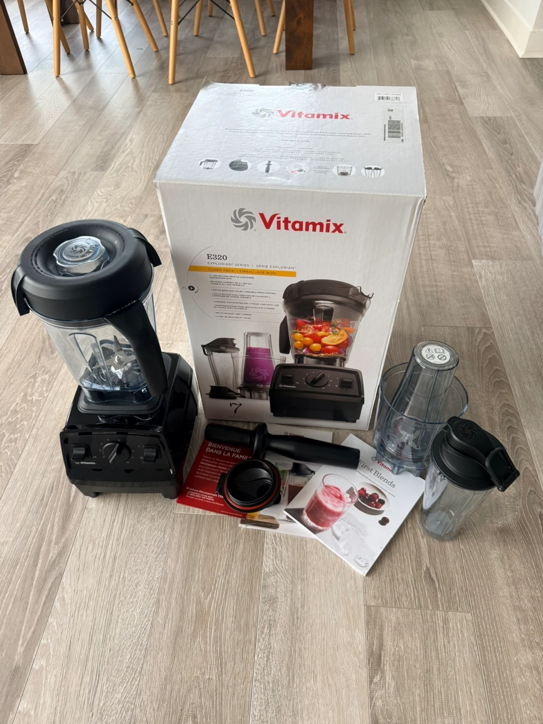 123Selling used Vitamix E320. The 2L low profile container very lightly used and personal cups has never been used. All booklets are still in original packaging, unsealed.