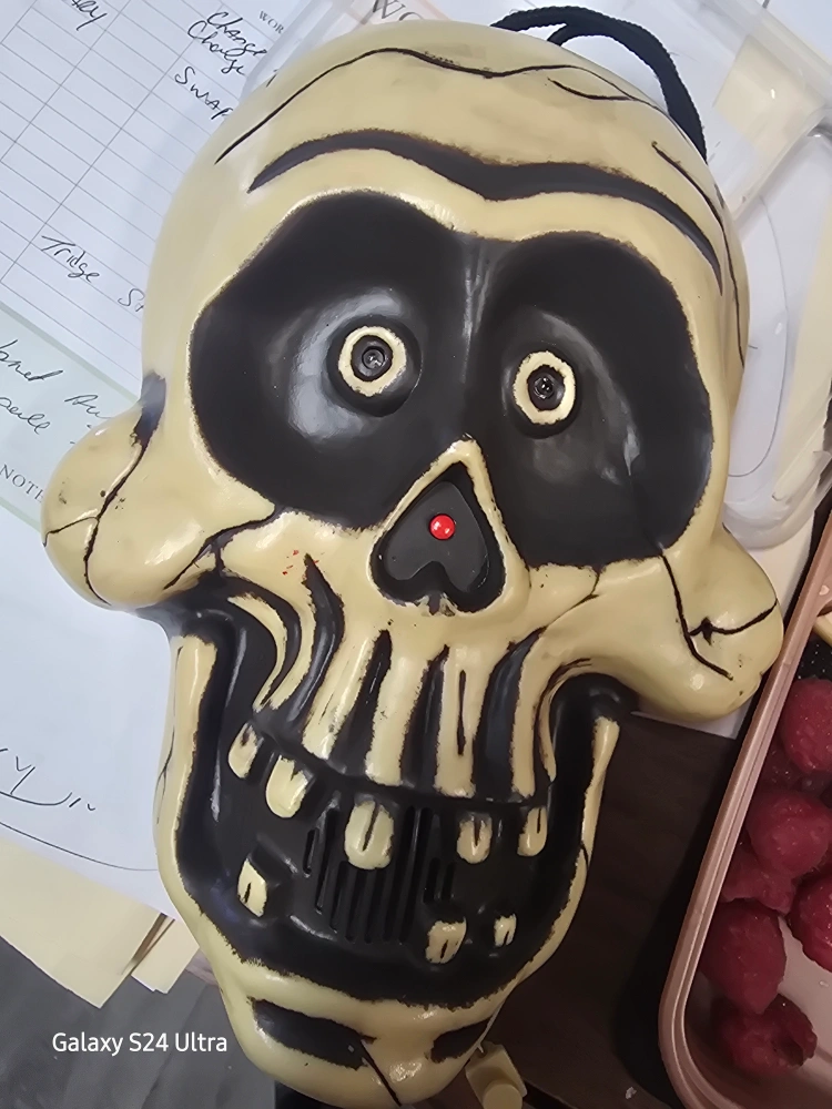 93Selling a skull mask, perfect for Halloween decorations or costumes! It has a unique design with black and beige colours. It's in good condition and ready to add a spooky touch to your Halloween setup. sings spooked jangles