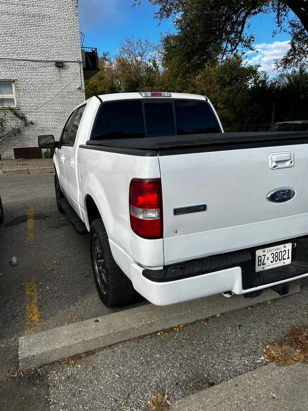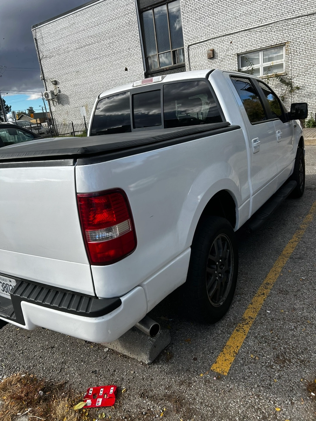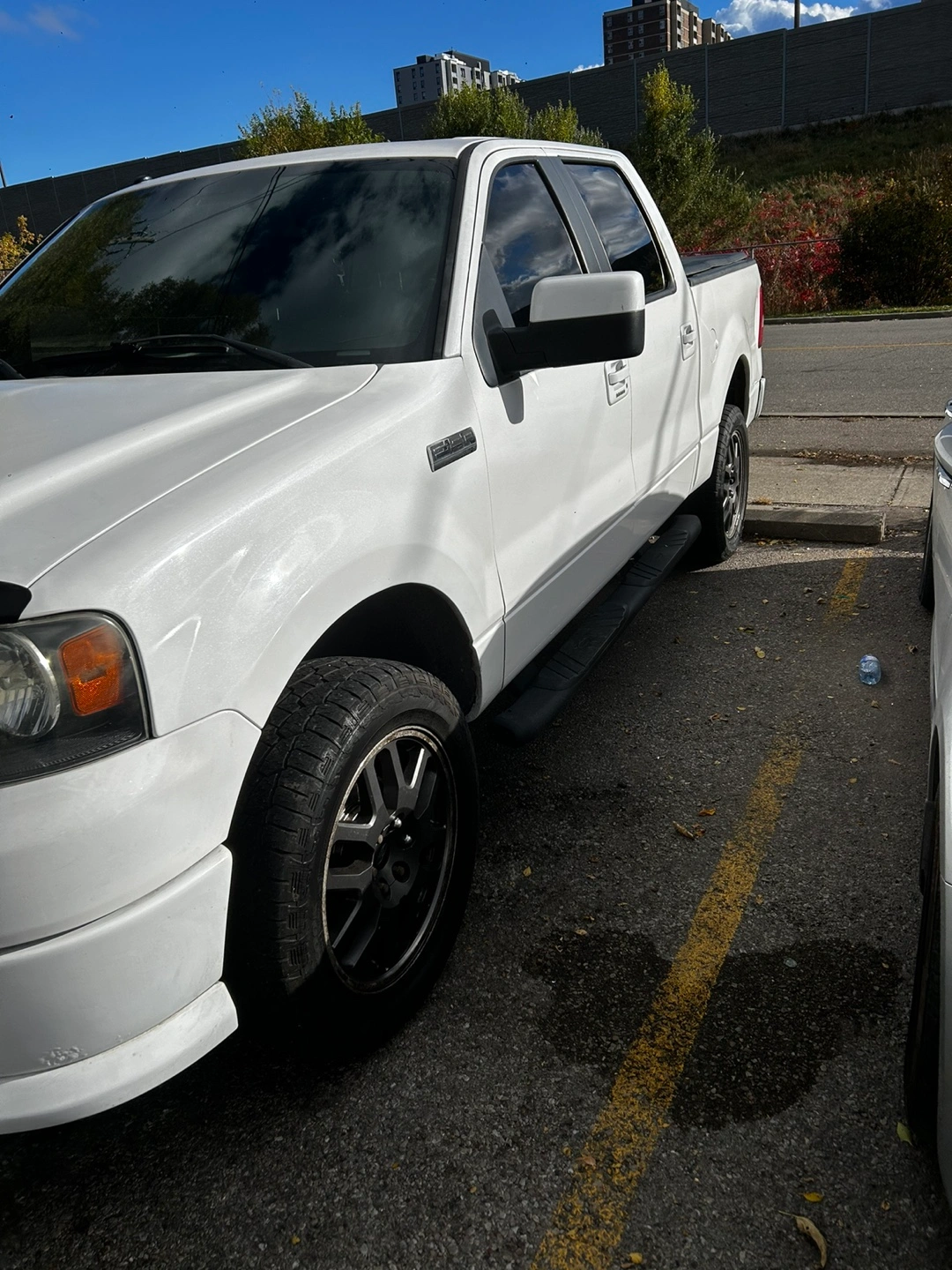 White Ford F150 truck with black interior. Four-door truck with black wheels. All brakes down recently Nothing wrong with truck Small v8 gas engine not the 5.7 triton engine Will need tires and exhaust