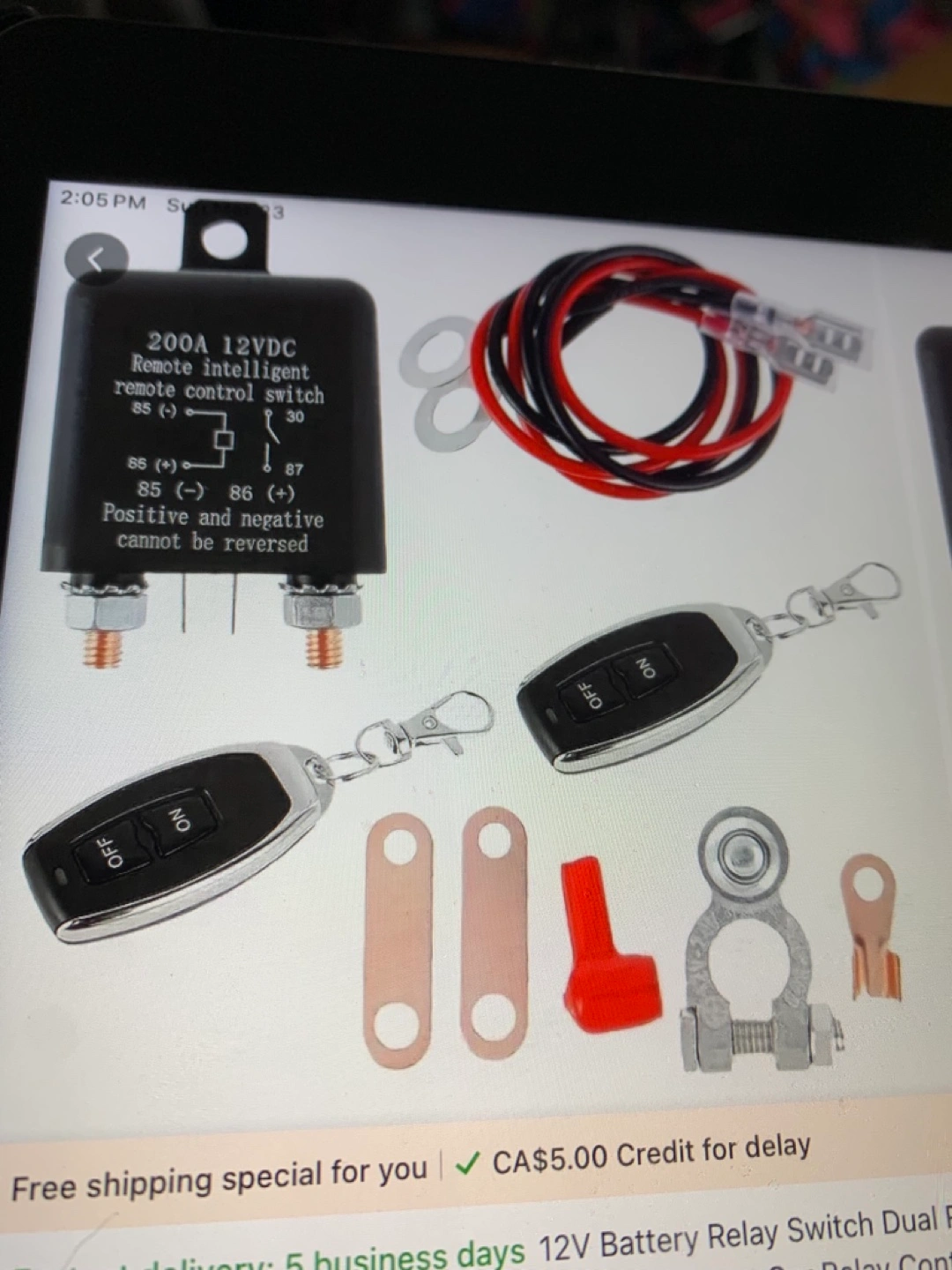 1012V battery relay switch. Includes remote, wiring, and connectors. Positive and negative cannot be reversed.