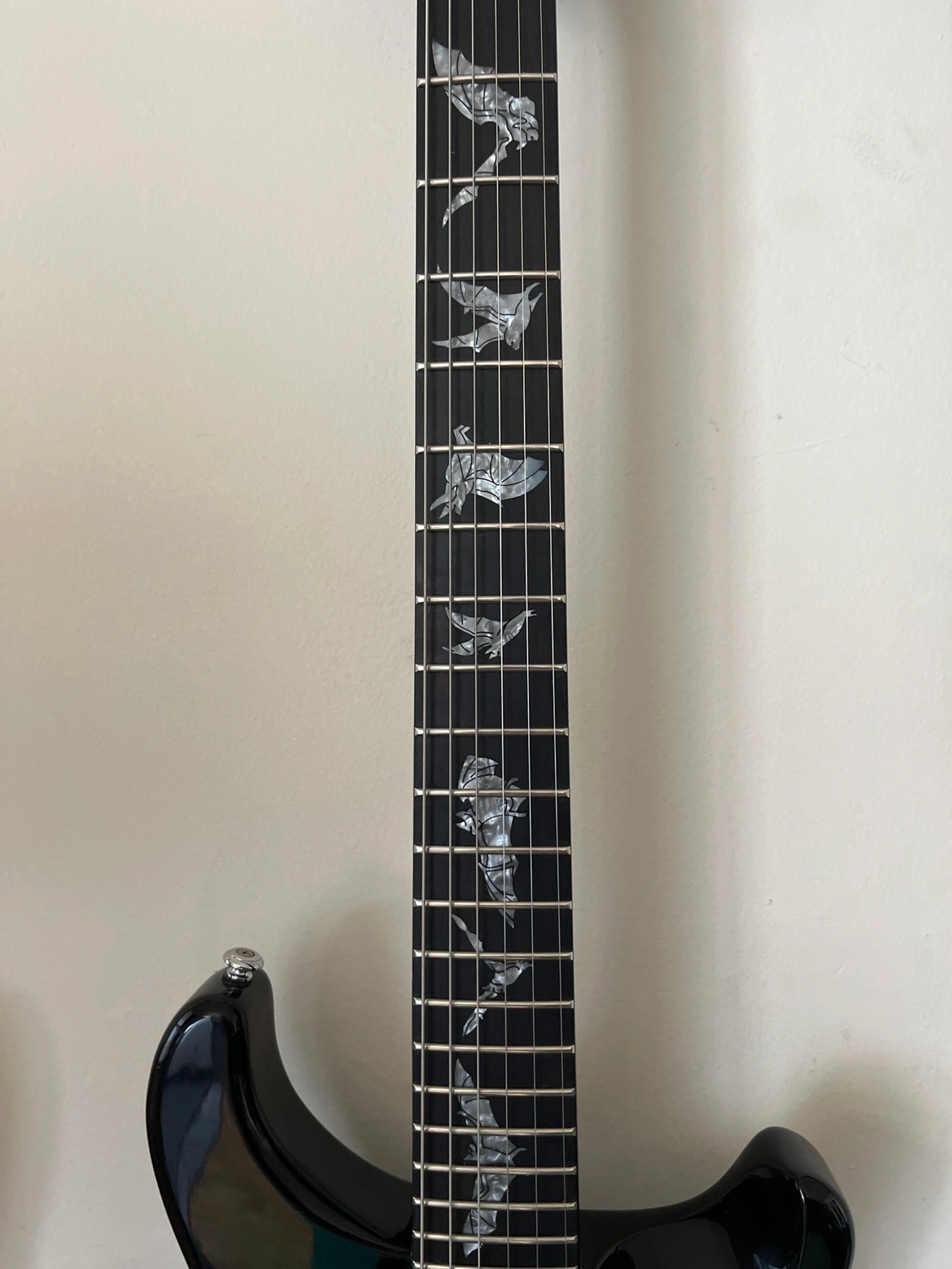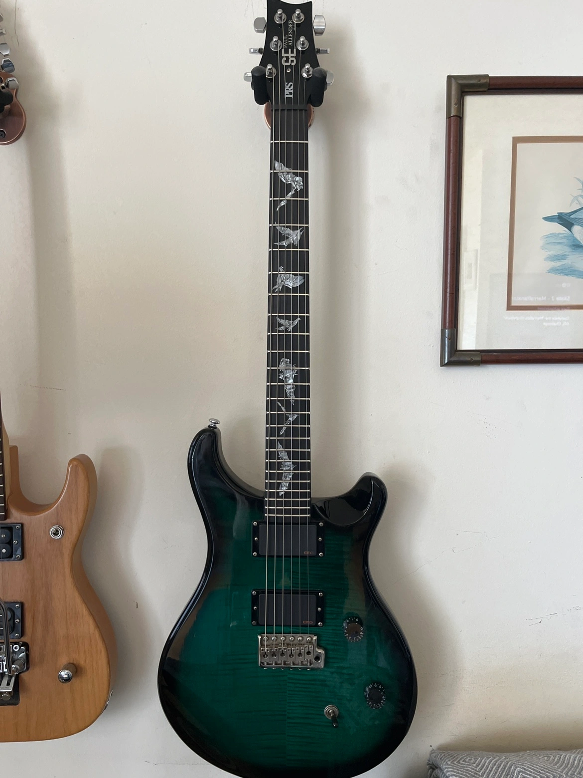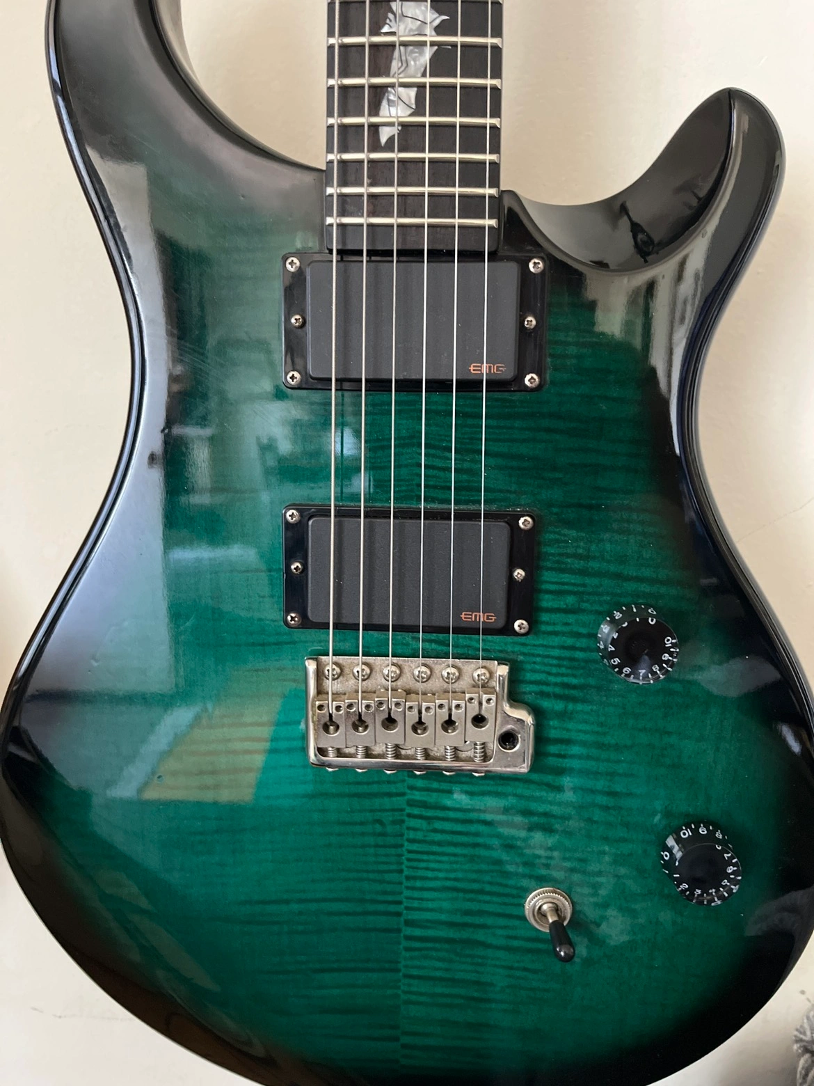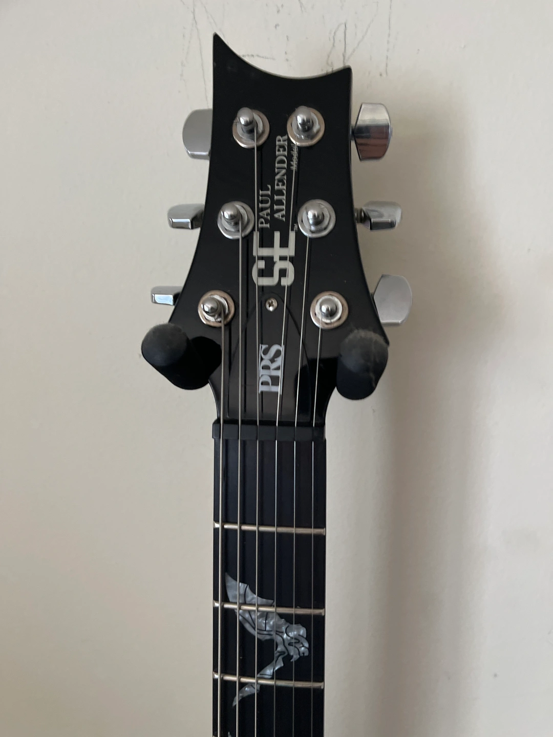Overview The SE Paul Allender is a signature guitar for the Cradle of Filth artist Features a mahogany body and maple neck, a maple top with quilted maple veneer, ebony fretboard with Bats inlay, 25” scale length, and PRS humbuckers Updated in 2010 to feature EMG picukps