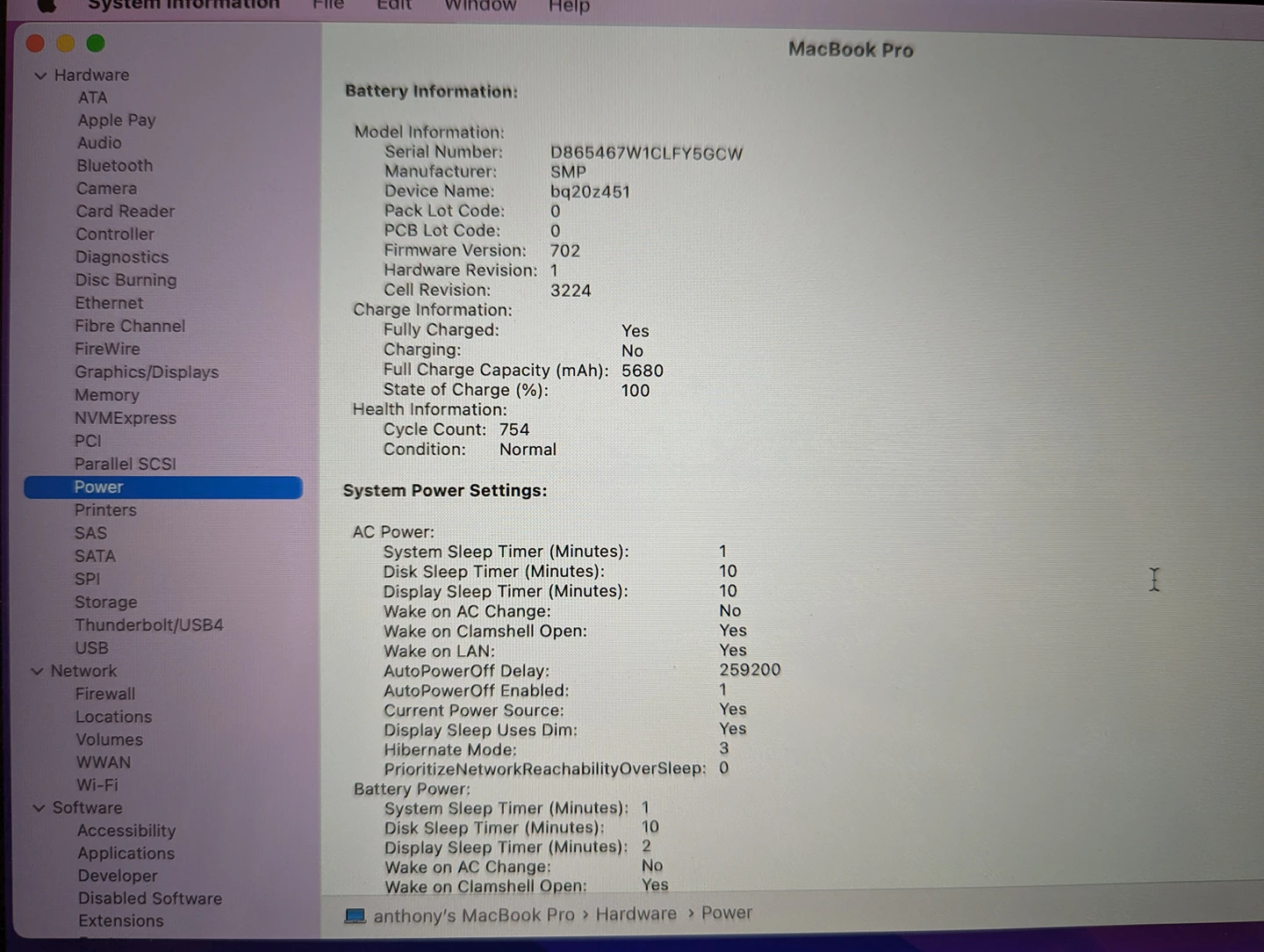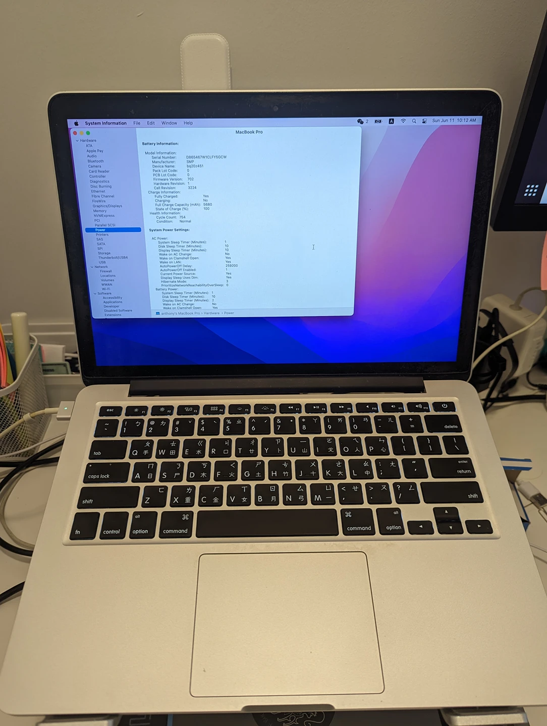 21MacBook pro bought in Taiwan (hence the keyboard). Everything is working good, except for the speakers which have some distortion in the output. The battery can hold for a couple of hours without any problem. The screen has some marks from when I was using a plastic protection on my keyboard. the markings kind of stayed on the screen after a long time when I decided to finally clean it. The charge is coming with it.