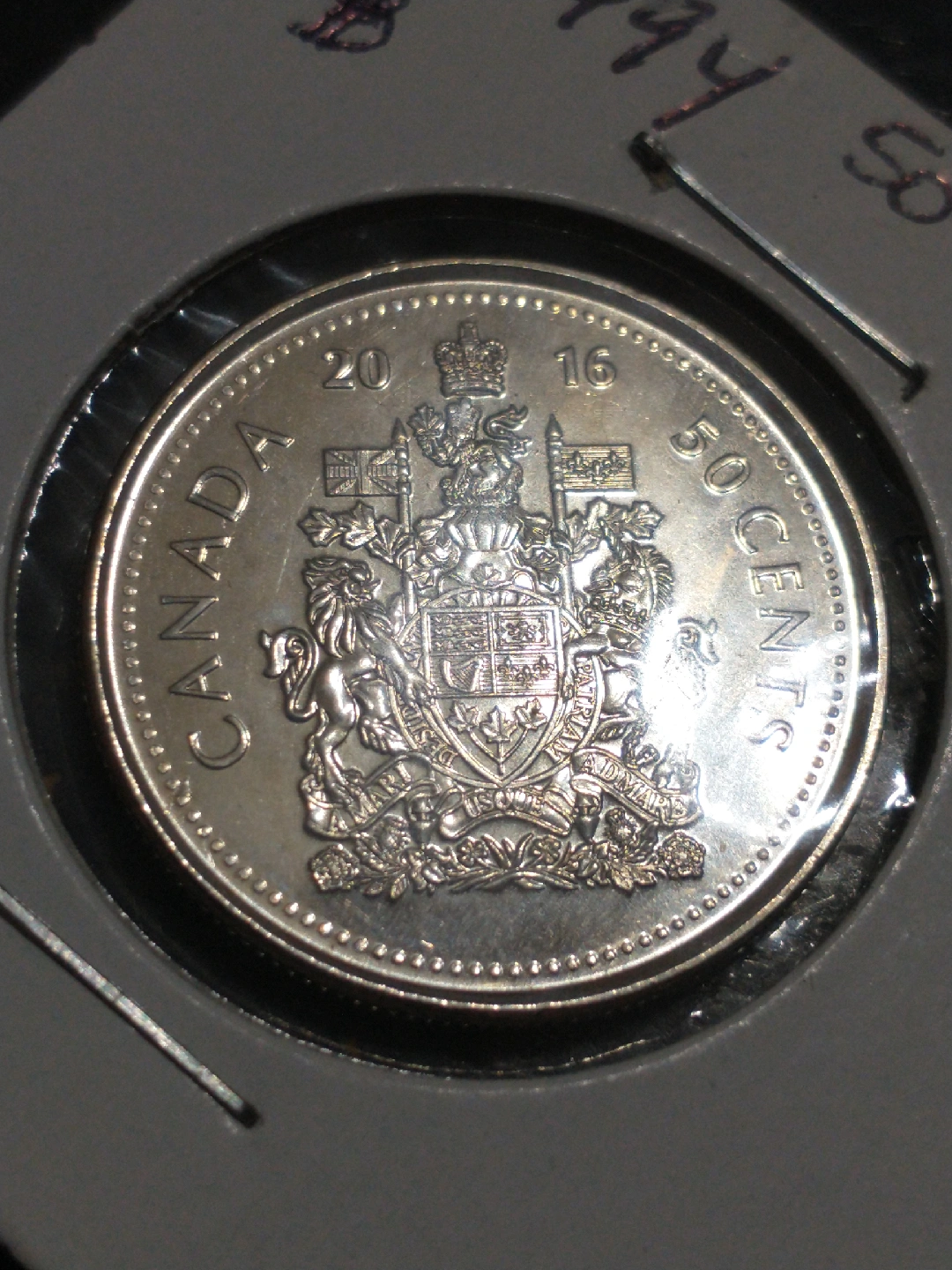 Selling a 2016 Canadian 50 cent coin featuring Queen Elizabeth II on one side and the Canadian coat of arms on the other